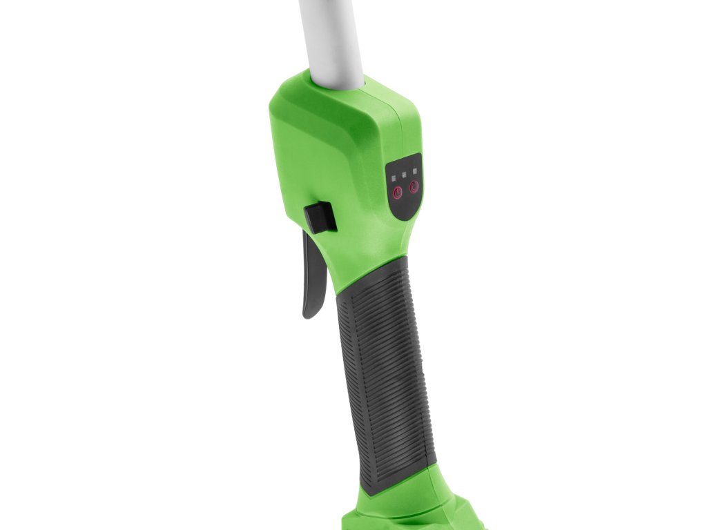 Oblouková rukojeť: umožňuje pohodlné a přirozené vedení křovinořezu jednou rukou, zajišťuje dobrou ovladatelnost a přesnou kontrolu při práci v úzkých nebo hůře přístupných místech. Obloukový tvar rukojeti usnadňuje manévrování kolem stromů, keřů, plotů a okrajů pozemků a zvyšuje komfort při delším používání.