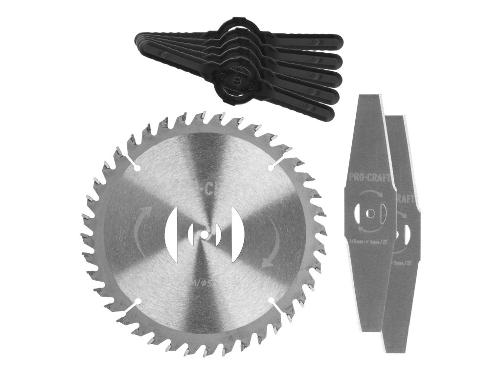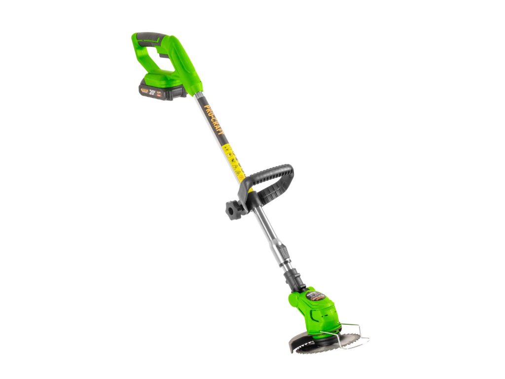 Aku vyžínač Procraft PTA24 s teleskopickou rukojetí a otočnou hlavou. Součástí balení jsou dvě baterie 20V 2Ah, nabíječka, 5 ks plastových čepelí, 2 ocelové nože a kotouč. Hmotnost 1,7 kg, otáčky 5500-8000/min.