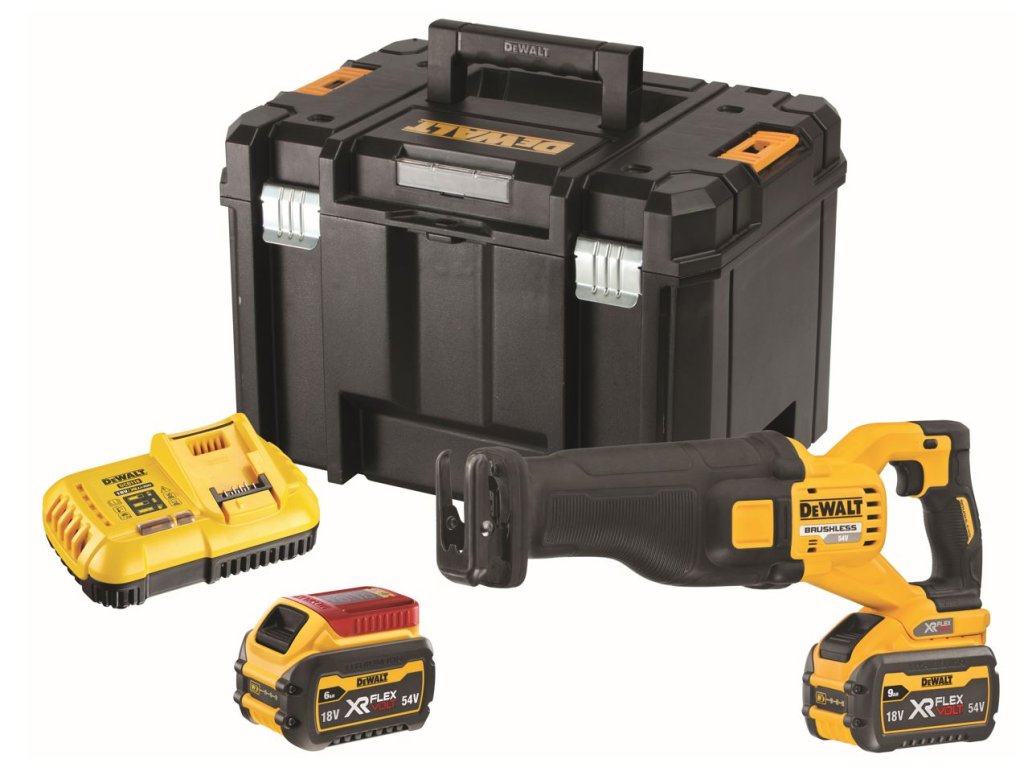 DCS389X2 DEWALT 54V XR AKU FLEXVOLT BEZUHLÍKOVÁ MEČOVÁ PILA, 2 X BATERIE 9,0 AH, NABÍJEČKA, KUFR T-STAK