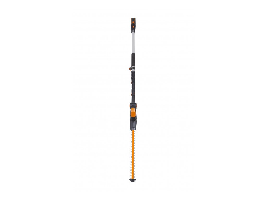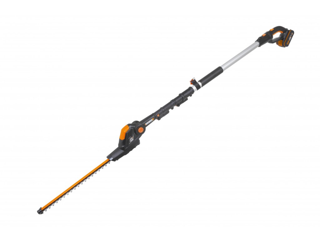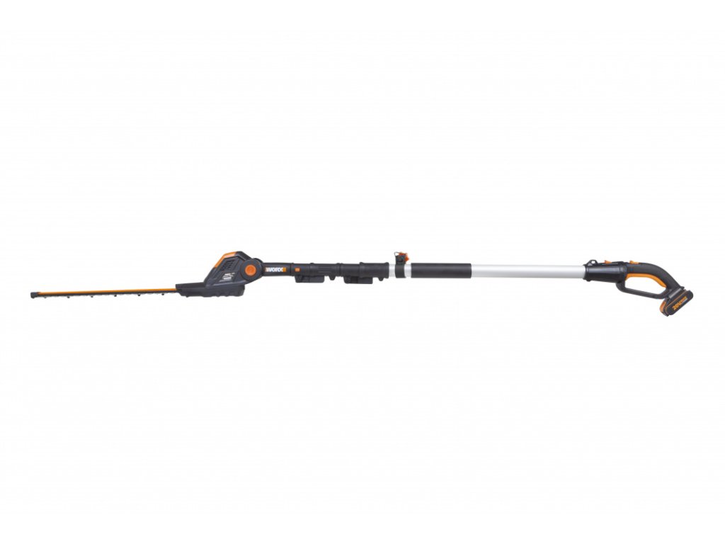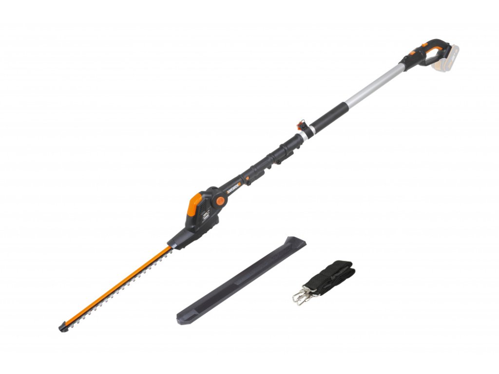 WG252E.9 - Aku plotostřih 20V, 45cm - bez akumulátoru - Powershare WG252E.9 - Aku plotostřih S tímto strojem značky Worx můžete snadno zkracovat vysoký i hluboký živý plot. Protože podle stupně výsuvu dosáhne tento stroj až do výšky 3,6 metru. Pro tyto účely disponuje prodlužovací tyčí s teleskopickým mechanismem. Díky aretačnímu tlačítku tyč zafixujete v požadované poloze. Tak dosáhnete snadno i na obtížně dostupné větve a vytvarujete živý plot do požadovaného tvaru. Samotné aku nůžky na živý plot pak představují silný řezný nástroj s lištou o délce 45 cm. I přes nezanedbatelnou délku lze s přístrojem snadno zacházet. Nůžky se zavěsí do ramenního popruhu, díky čemuž je lze nosit bez jakékoliv větší námahy.