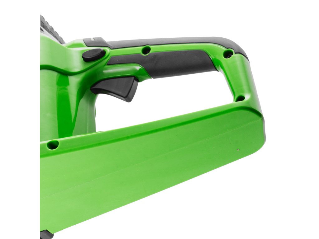 Ruční bezpečnostní brzda řetězu: umožňuje okamžité zastavení řetězu při uvolnění spínače nebo v případě nečekaného zpětného rázu. Zvyšuje bezpečnost práce a kontrolu nad pilou při každém řezu.