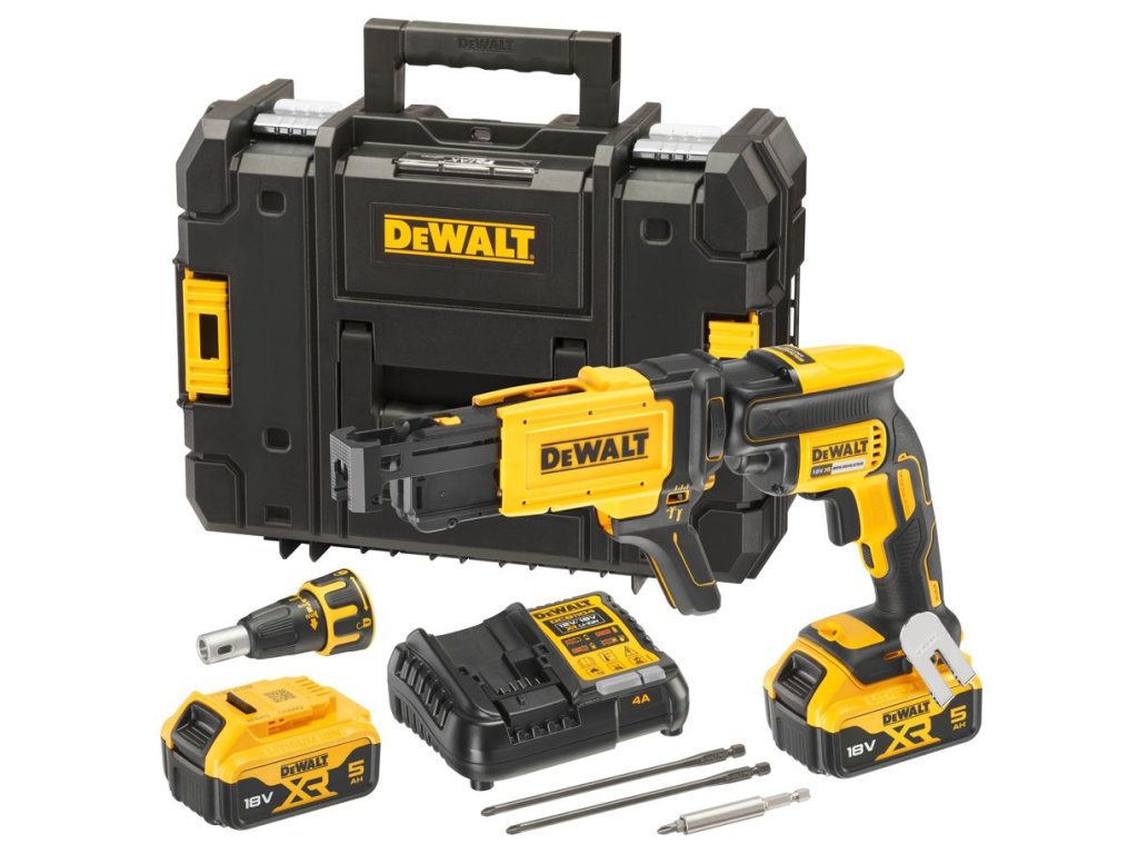 DCF620P2K DEWALT AKU 18V BEZUHLÍKOVÝ ŠROUBOVÁK NA SÁDROKARTON, 2 X 5,0 AH BATERIE, NABÍJEČKA, PODAVAČ VRUTŮ, KUFR T-STAK
