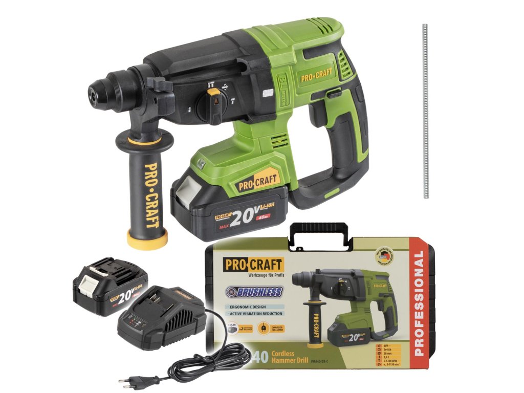 Aku vrtací kladivo Procraft PHA40 s bezuhlíkovým motorem, 2 bateriemi 20V 4Ah a nabíječkou. Režimy vrtání, příklep a sekání, síla úderu 2,6 J, otáčky 0–1150/min, příklepy 0–5300/min. Ideální pro stavební a renovační práce.