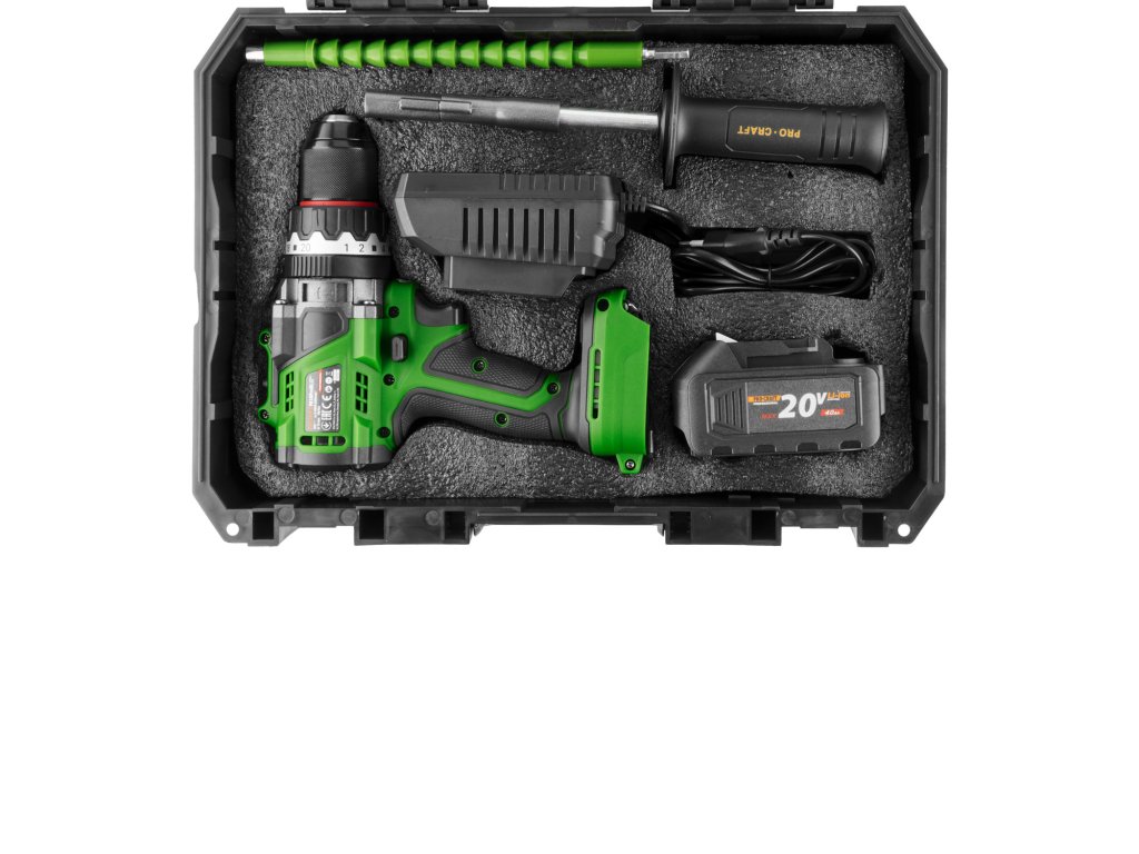 Bezuhlíkový motor. PŘÍKLEP, Součástí balení: přídavná rukojeť, ohebná hřídel, kufr, baterie 20V 4Ah a nabíječka. Kroutící moment: 180Nm, Celokovové sklíčidlo 13mm, Integrovaná LED svítilna, 2 rychlosti 0-500/0-2000, plynulá regulace otáček.