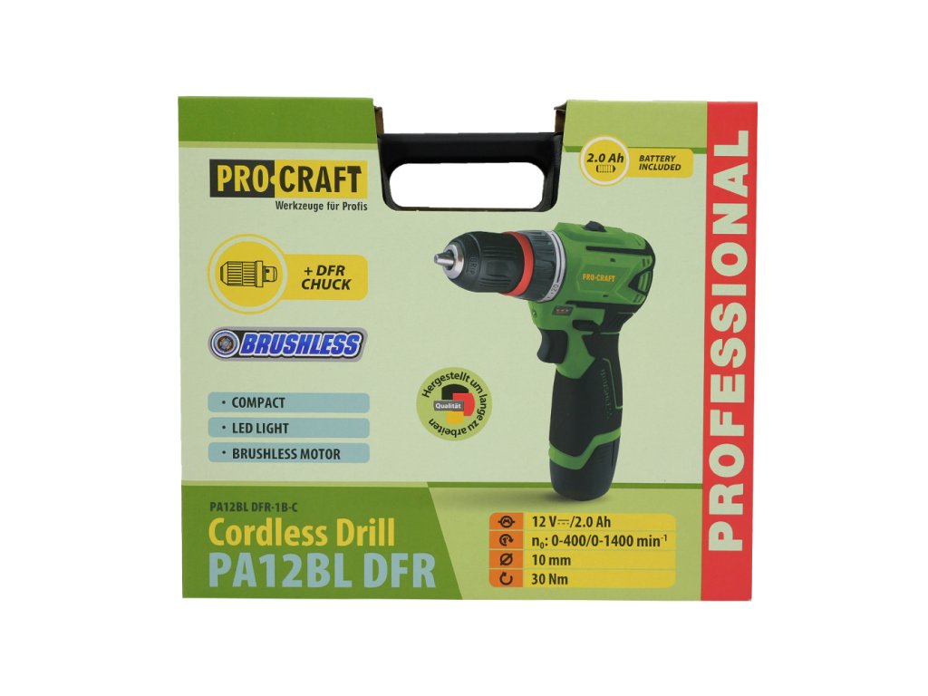 AKU vrtací šroubovák Procraft PA12BL DFR je praktický pomocník pro použití všude tam, kde při vrtání a šroubování nechcete být omezováni přívodním kabelem. Šroubovák s možností změny směru otáček pravý/levý chod a utahováním momentem až 30Nm je vhodný ke šroubování vrutů, matic a šroubů s použitím 1/4" nástavců - bitů. Možnost nastavení utahovacího momentu ve 20 stupních. Rychloupínací sklíčidlo umožňuje upnutí vrtáků a stopkových nástrojů do průměru 10mm. Šroubování na 1. a vrtání na 2. rychlostní stupeň lze provádět s plynulou regulací otáček. Stroj je vybaven integrovaným LED osvětlením pracovní plochy s funkcí dosvitu. Součástí dodávky jsou 1 akumulátor 12V 2Ah, nabíječka a transportní plastový kufr.
