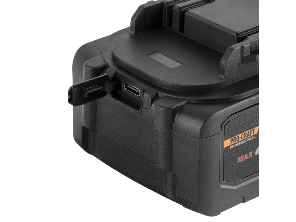 Akumulátor Procraft 20/4 představuje novou generaci baterií pro 20V platformu Procraft. Nabízí kapacitu 4 Ah, která poskytuje ideální rovnováhu mezi hmotností, výkonem a dobou provozu. Nově je vybavena USB-C portem s funkcí Power Delivery 45 W, takže ji lze nabíjet přímo přes USB-C nebo ji využít jako powerbanku pro nabíjení telefonu a další elektroniky.