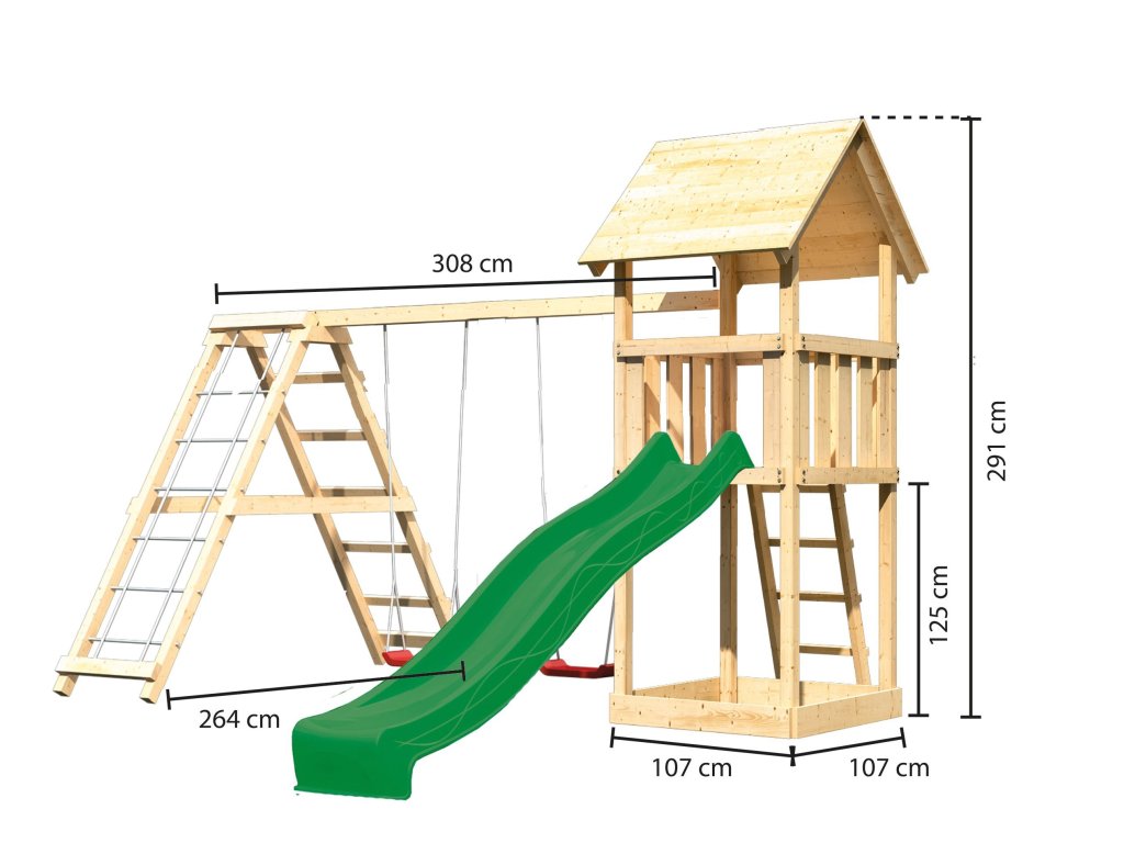 Dětské hřiště KARIBU LOTTI poskytuje dětem spoustu možností ke hrám. Nabízí vše k tomu, aby děti mohly prožít veškeré své hrací fantazie. Stejně jako u všech našich dětských hřišť i u modelu KARIBU LOTTI používáme výhradně to nejlepší smrkové dřevo. Hřiště má nosné sloupy o tloušťce 68 x 68 mm a je vyrobené z dřevěných profilů o síle 18 mm (spoje v systému pero / drážka). Naše dřevo pochází ze vzdáleného severu Evropy a je chemicky naprosto neošetřené. V důsledku toho je prosté všech známých problematických látek. Díky výšce plošiny 125 cm nabízí hřiště KARIBU LOTTI dětem dokonalý výhled na zahradu. Hřiště je standardně vybaveno robustním dřevěným žebříkem se 4 příčkami a pískovištěm pod věží. Dětské hřiště KARIBU LOTTI má samozřejmě certifikát TÜV Nord ověřující bezpečnost výrobku (GS) podle DIN EN 71-1, DIN EN 71-3, DIN EN 71-8 a AfPS GS 2014.