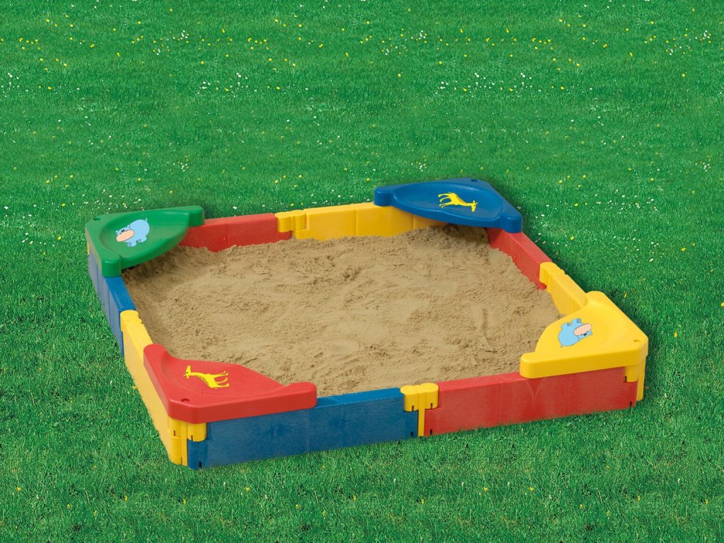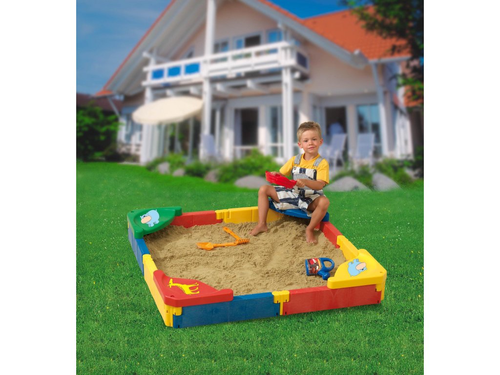 Dětské pískoviště VARIO vyrobené ze skládacích plastových pestrobarevných dílů. Rozměry 127 x 127 x 17 cm. V každém rohu pískoviště je sedátko označené obrázkem zvířátka. Dodáváme bez písku. Výrobek je určen výhradně pro soukromé (domácí) využití. Dodáváme jako stavebnici v rozloženém stavu.