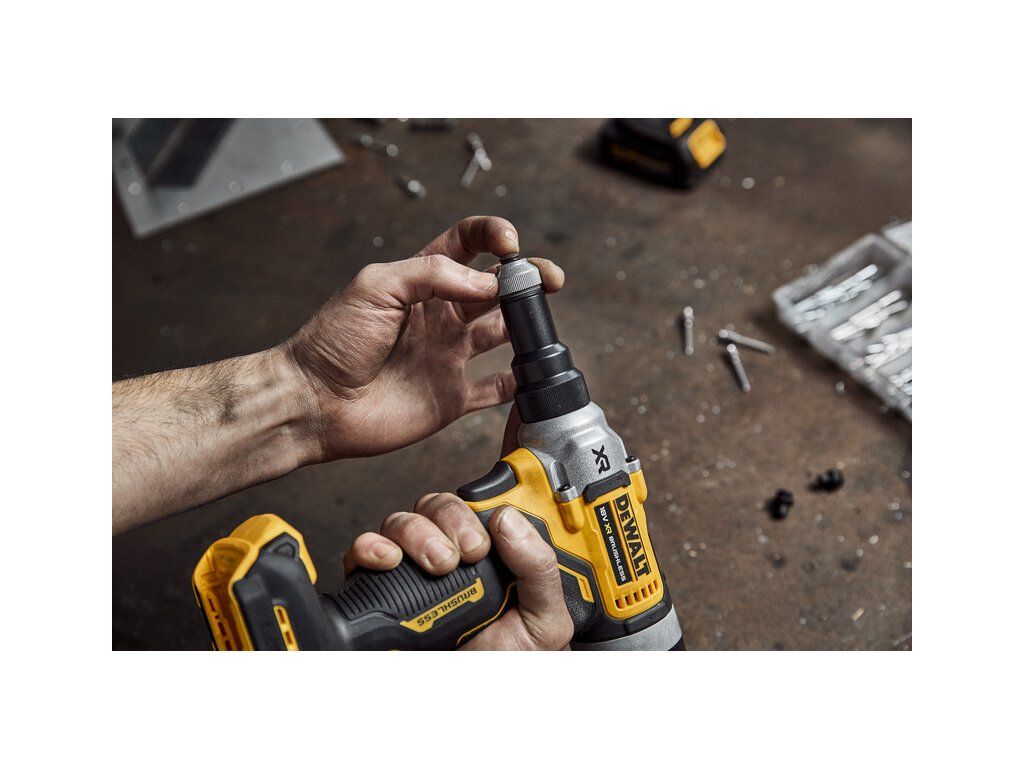 - Výměna trysky je u těchto kleští hračkou. Bez námahy a bez potřeby nástrojů můžete trysku vyměnit v průběhu několika sekund. S Aku nýtovacími kleštěmi DEWALT DCF414 se nýtování stává rychlou a jednoduchou prací.
