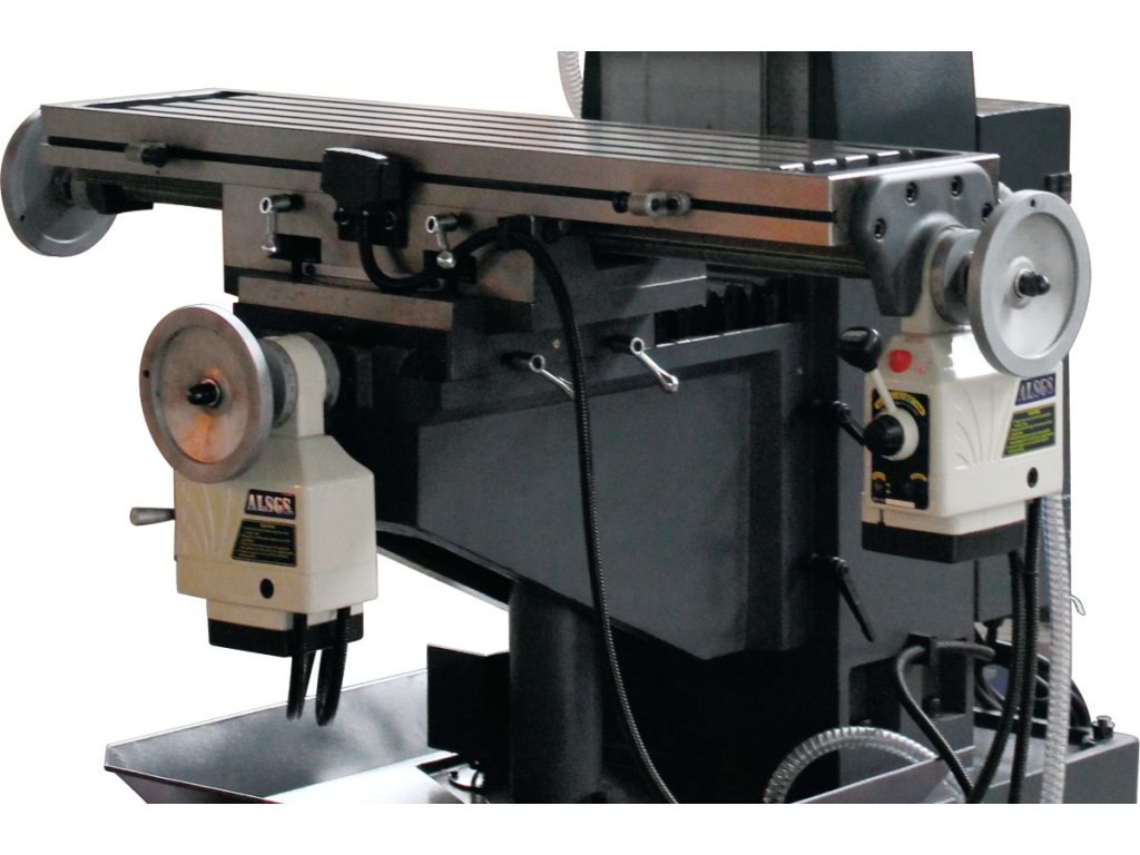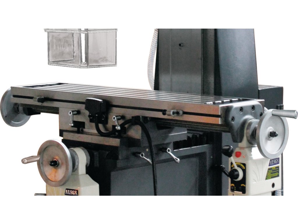 - Solidní a velkoryse dimenzovaný křížový stůl s přesně opracovaným povrchem, T-drážkami a nastavitelnými lištami