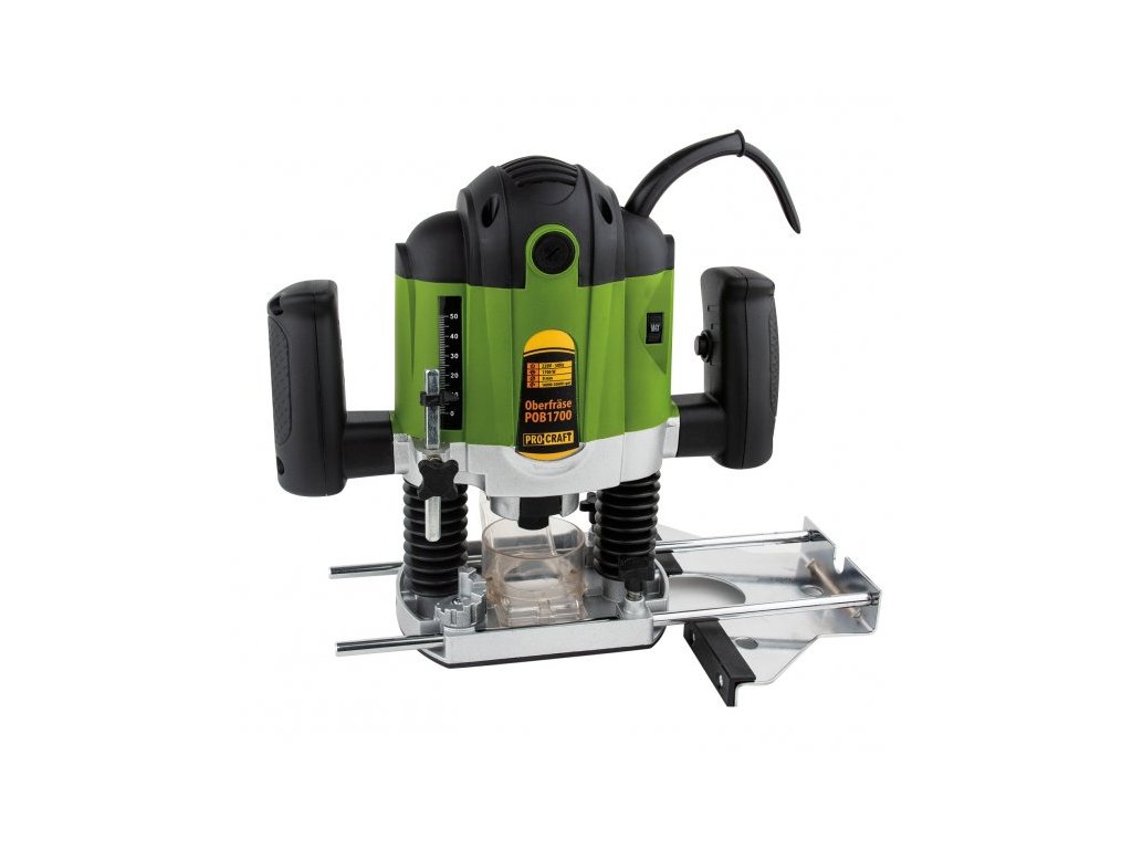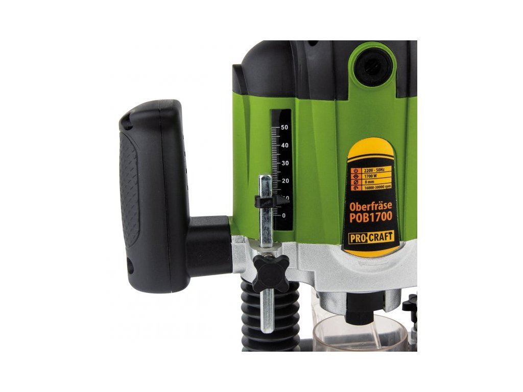 Fréza ruční Procraft POB1700 je určena k frézování profilů, hran, otvorů do dřeva. Jedná se o optimální model se silný motorem s výkonem 1200 W a vysokými otáčky až 30000 zaručuje dlouhodobou a bezporuchovou práci. Regulace otáček v rozsahu 16000-30000 za minutu umožňuje nastavení optimálních parametrů při práci s různými materiály. Lze použit frézy se stopkami 6 a 8 mm. Základna umožňuje přesné nastavení hloubky řezu v rozsahu 0-50 mm. Součástí dodávky je 12 fréz, podélný doraz s vodícími tyčemi, upínací kleštiny, uhlíkové kartáče a adaptér na odsávání. Balení karton.
