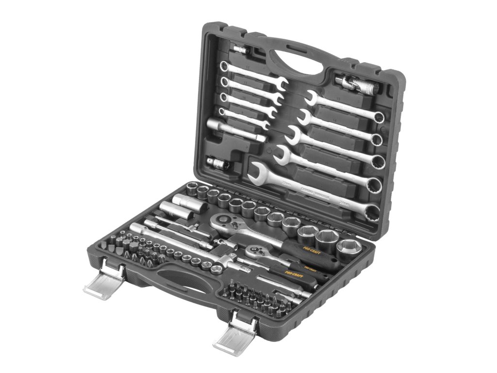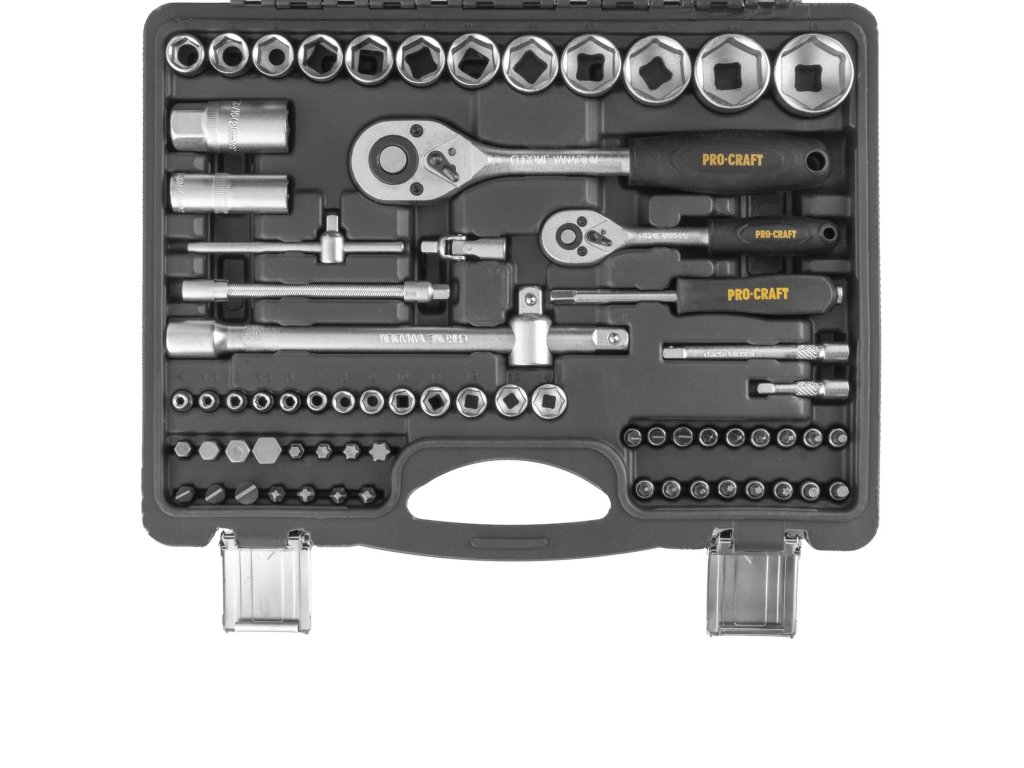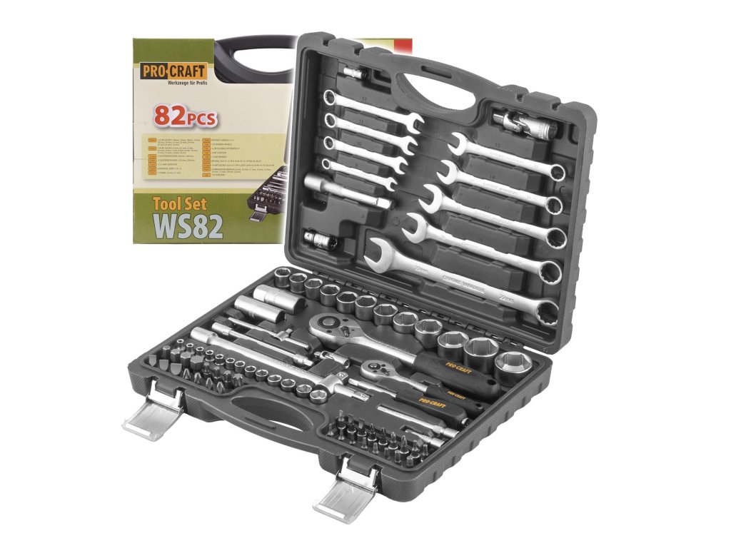 Sada ručního nářadí Procraft WS82, 82 dílů Součástí balení: 12x 1/2" Hlavice nástrčné, 13x 1/4" hlavice nástrčné, 2x 1/4" prodlužovací nástavec, 2x 1/2" prodlužovací nástavec