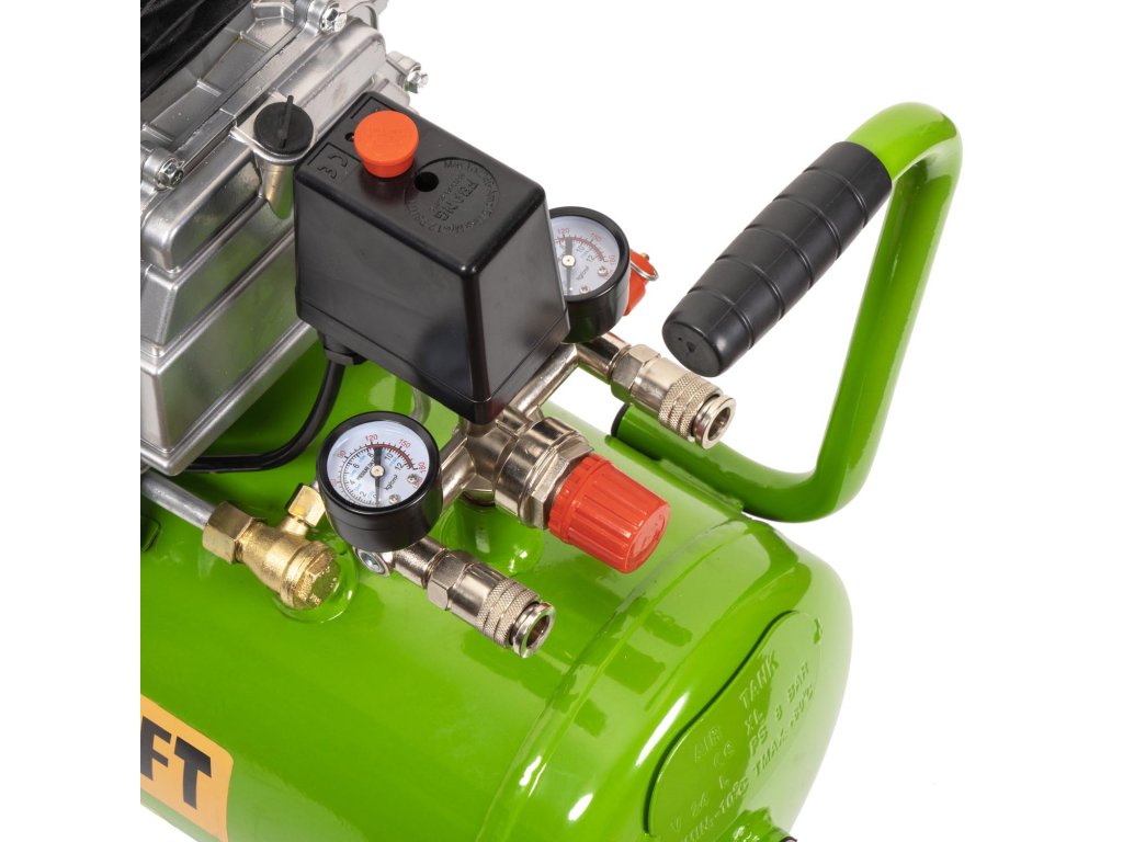 Kompresor Procraft AC24 je určen ke stlačení vzduchu pro provoz pneumatického nářadí, huštění pneumatik. Silný motor s výkonem 1200 W zaručuje vysoký sací výkon až 196 l/min. Mazání olejem zvyšuje životnost kompresoru, a optický ukazatel usnadňuje kontrolu jeho stavu. Regulace výše pracovního tlaku umožňuje nastavení optimálních parametrů podle zvoleného vzduchového nářadí. Rychlospojky vývodů usnadňují a zrychlují práce. Součástí dodávky jsou přepravní kola, pryžové botky. Balení karton.