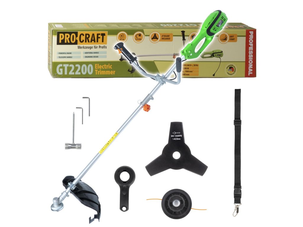 Elektrický křovinořez Procraft GT2200 s řidítky. Součástí balení: strunová hlava, kovový 3.zubí nůž, popruh a montážní klíč. Poloautomatické ovládání vysouvání struny. Příkon (W) 1200 Otáčky (min-1) 7000 Soft start. Průměr nože (mm) 230