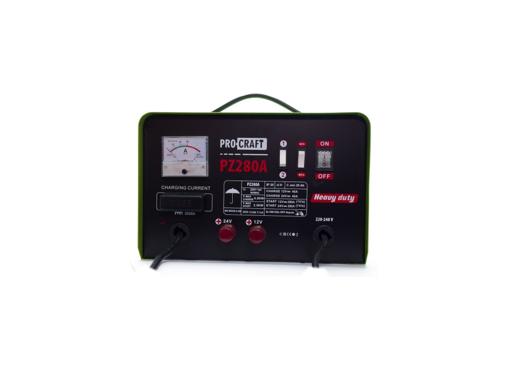 Procraft PZ280A je výkonná nabíječka autobaterií kombinovaná se startovacím zdrojem, která je ideální pro osobní i nákladní automobily, motocykly, dodávky a další vozidla. Díky vysokému nabíjecímu proudu až 20 A a startovacímu proudu 280 A zvládne spolehlivě dobíjet a nastartovat i velké motory.