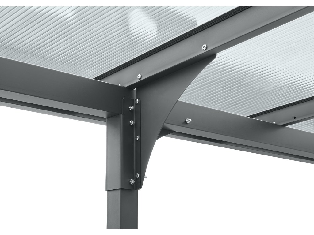 Zahradní hliníková pergola s polykarbonátovou střechou. Konstrukce pergoly je z odolné hliníkové slitiny nastříkané práškovou vypalovanou barvou (komaxit), proto trvale odolává přírodním klimatickým vlivům. Střecha je vyrobená z polykarbonátových dvoustěnných desek síly 6 mm, které dodáváme ve 3 odstínech - čiré nebo mléčně bílé průsvitné (tvz. OPÁL) nebo kouřově hnědé (BRONZ). Z důvodu zajištění maximální kvality je použit kvalitní polykarbonát MARLON (výrobce Brett Martin Velká Británie), který v ČR prošel náročným testy ve státem akreditovaných zkušebnách jako stavební materiál. Smluvní prodloužená záruka 10 let na nerozbitnost polykarbonátu krupobitím je u produktů od LANIT PLASTU samozřejmostí.