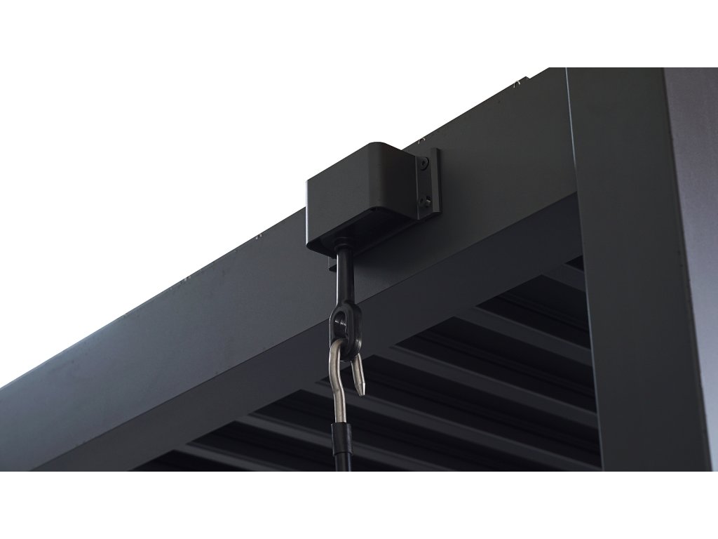 Pergolu lze vybavit stahovatelnými síťovými bočními roletami (příplatkové příslušenství), které poskytnou dodatečné zastínění a soukromí. Rolety lze snadno povytáhnout a zafixovat podle aktuálních potřeb. To vám umožňuje vytvořit si útulné prostředí i při větším slunečním žáru nebo v chladnějším počasí.