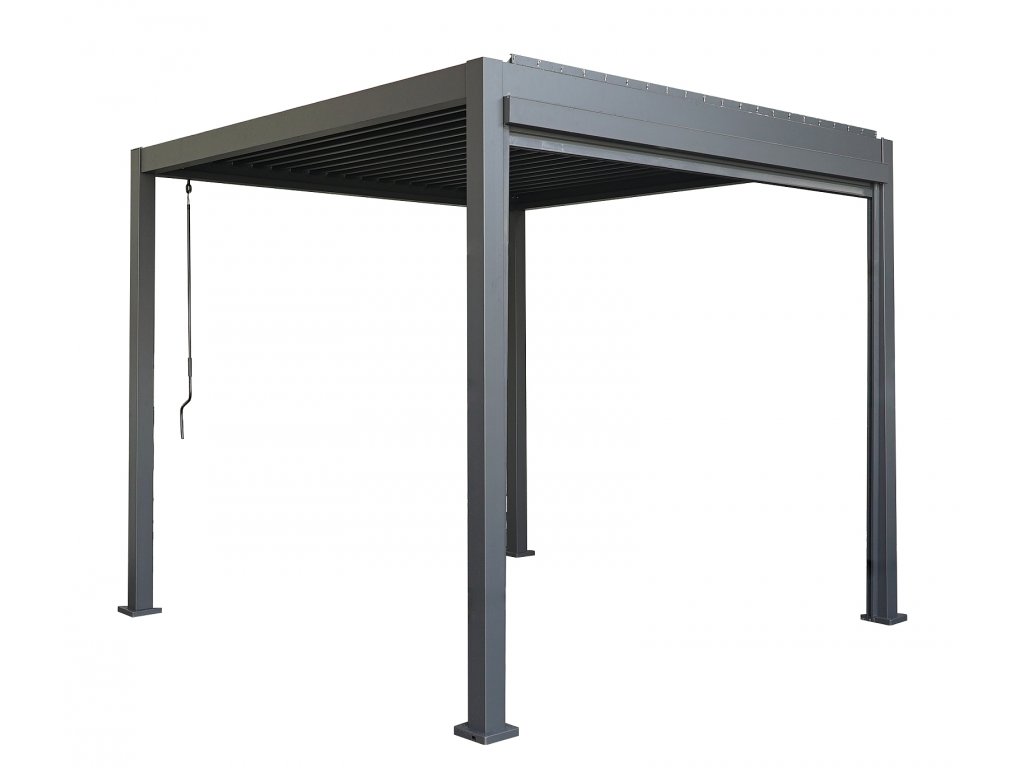 Zahradní hliníková pergola s vodorovnou střechou a manuálním ovládáním střešních lamel. V pergole naleznete příjemné místo k odpočinku v horkých letních dnech. Střecha je složená z desítek otočných lamel a ochrání Vás před nepříznivým počasím. Lamely je možné manuálně otáčet v úhlu 0 až 90o. Malá ručně ovládaná klika ovládá mechanismus střechy a otáčením kliky zajistíte synchronizované natáčení lamel. Úhel natočení 90o zajistí otevřenou střechu a úhel 0o zcela uzavřenou střechu. Lamely lze nastavit i do pouze pootočeného stavu a regulovat tím množství slunečního světla pronikajícího do pergoly. Konstrukce je vyrobená z odolné hliníkové slitiny a je nastříkaná práškovou vypalovanou barvou (komaxit), a proto odolává přírodním klimatickým vlivům.