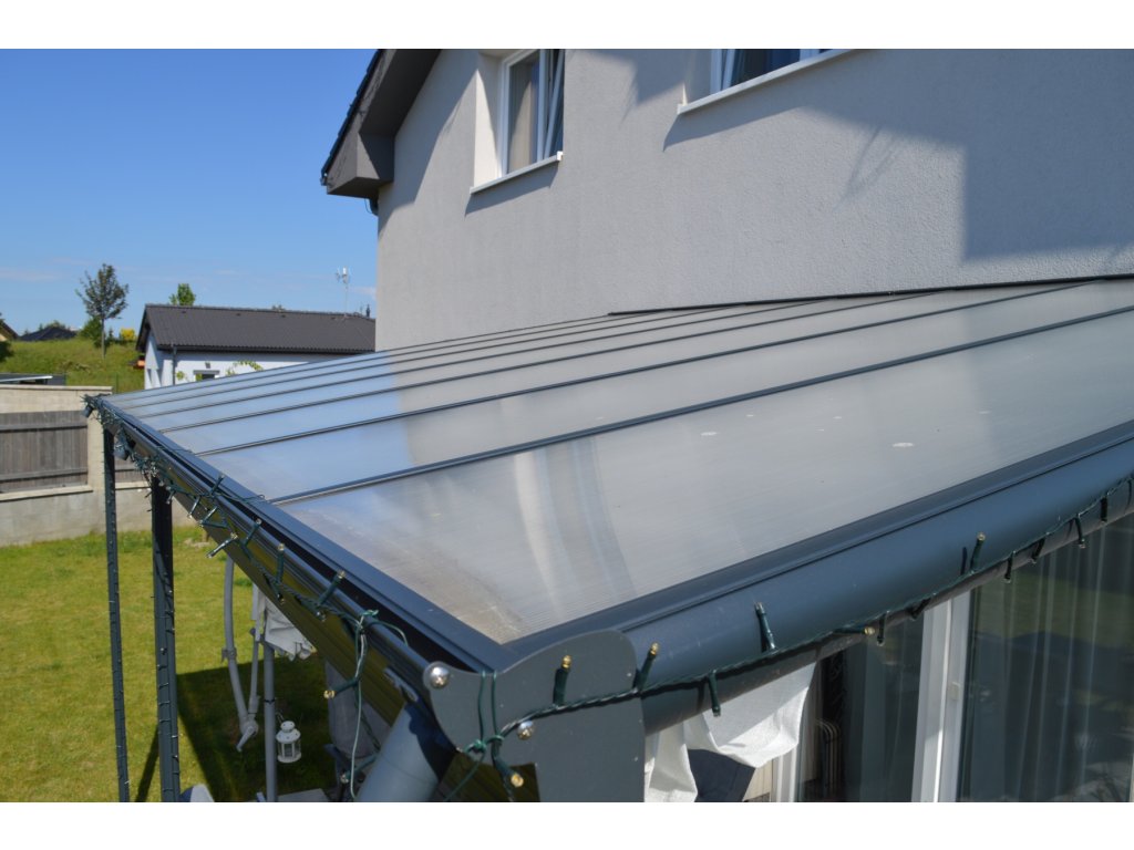 Hliníková pergola ke zdi, ve které naleznete příjemné místo odpočinku hned vedle vašeho domu. Konstrukce pergoly je z odolné hliníkové slitiny a je nastříkaná práškovou vypalovanou barvou (komaxit), a proto trvale odolává přírodním klimatickým vlivům. Střecha je vyrobená z polykarbonátových komůrkových dvoustěnných desek síly 6 mm, které dodáváme ve 3 odstínech - čiré nebo mléčně bílé průsvitné (tvz. OPÁL) nebo kouřově hnědé (BRONZ). Z důvodu zajištění maximální kvality používáme na střechu pergoly výhradně prémiové komůrkové polykarbonátové desky MARLON ST LONGLIFE (výrobce BRETT MARTIN Velká Británie), které v ČR prošly náročným testy ve státem akreditovaných zkušebnách jako stavební materiál (požární zkoušky, mechanické zkoušky, zdravotní nezávadnost). Na nerozbitnost polykarbonátové střechy krupobitím poskytujeme smluvní prodlouženou záruku 10 let.