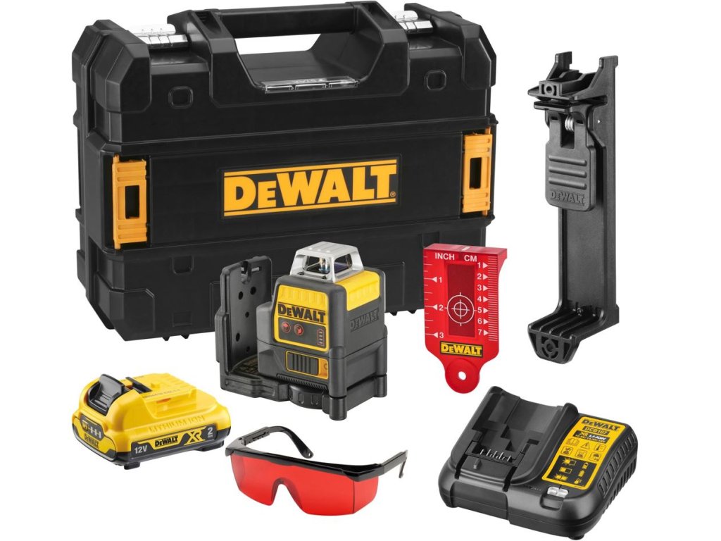 DCE0811D1R DEWALT 12V AKU KŘÍŽOVÝ ČERVENÝ LASER, 2 X 360°, 1 X 2,0 AH BATERIE, NABÍJEČKA, KUFR