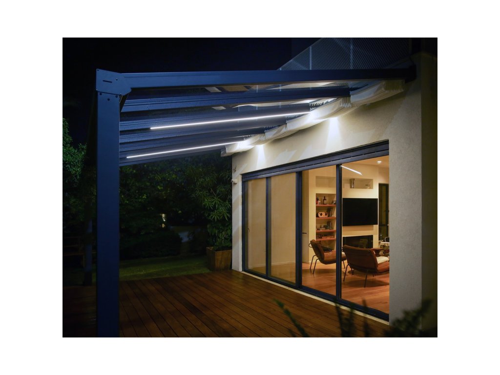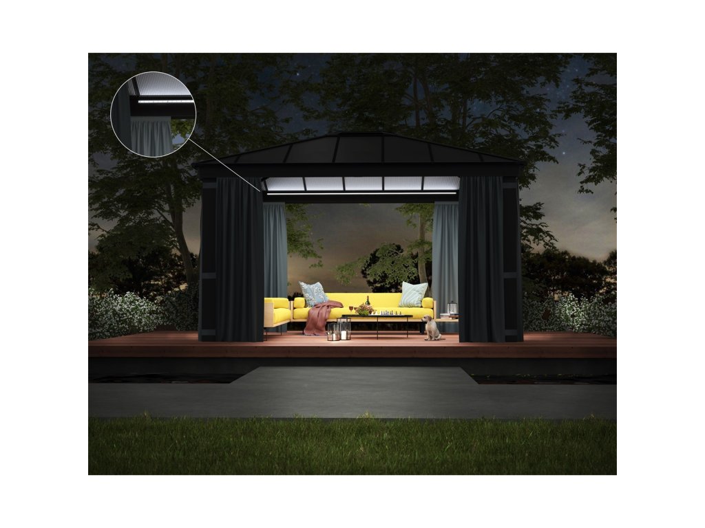 LED osvětlovací systém 2,7 m s dálkovým ovládáním Dlouhý pás LED osvětlení, nejenže krásně prosvětlí prostor, ale přidá vaší pergole nebo altánu elegantní nádech. Snadno a skrytě se instaluje do drážky v kovovém profilu. Díky dálkovému ovladači je ovládání jednoduché a pohodlné. Led osvětlení je možno použít na celou řadu výrobků Palram (garážová stání, altány, zimní zahrady, pergoly, skleníky atd.). Rozměr: délka 2,7 m Teplota osvětlení: 3500 K Svítivost: 700 Lumenů Voděodolnost: IP 67 (ovladač IP 68)Doplňkové parametry