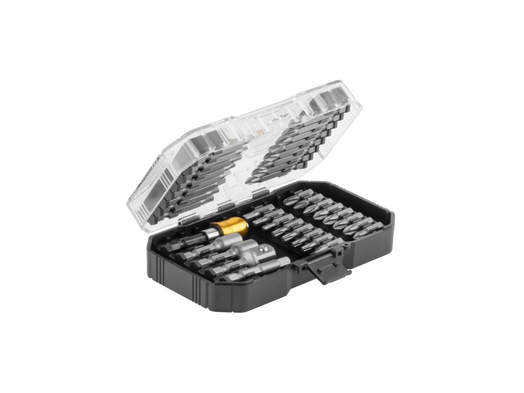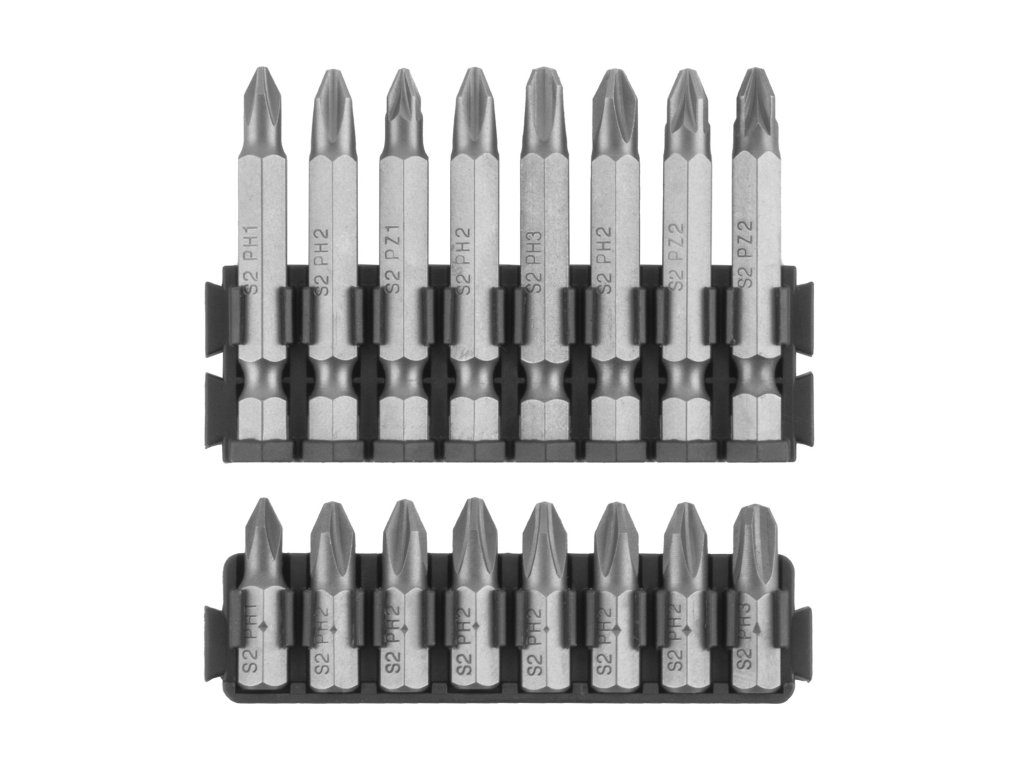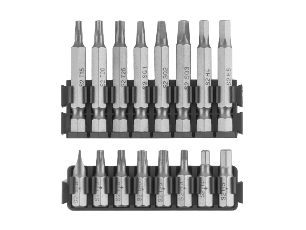 16 ks 50mm bitů: Phillips: PH1, PH2x3, PH3, Pozi: PZ1, PZ2x2, Torx: T15, T20, T25, Square: SQ1, SQ2, SQ3, Imbus: H4, H5