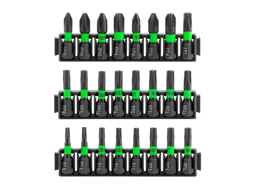 25 ks 25mm bitů: Phillips: PH1x1, PH2x2, PH3x1, Pozi: PZ1x1, PZ2x1, PZ3x1, Torx: T10x2, T15x3, T20x5, T25x4, T27x1, T30x1, T20 Security, T25 Security
