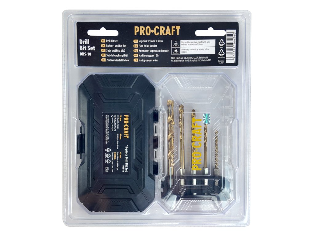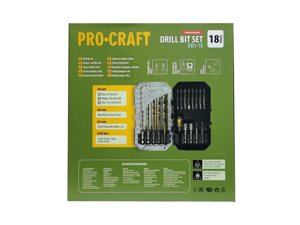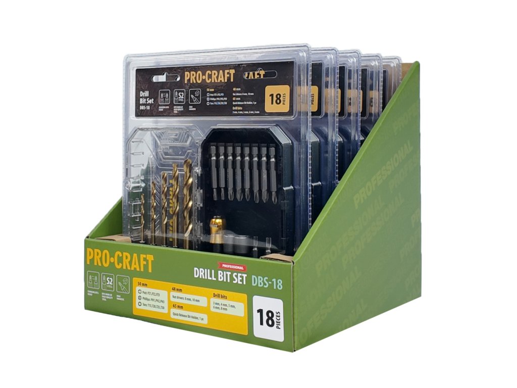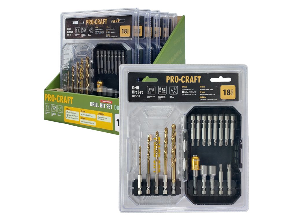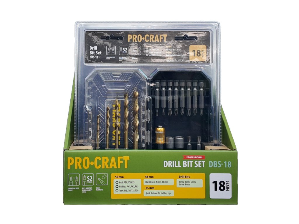 18dílná sada vrtáků a bitů Procraft DBS-18 je ideálním doplňkem pro každého kutila i profesionála, který hledá spolehlivý a cenově dostupný nástroj pro širokou škálu montážních a opravárenských prací.