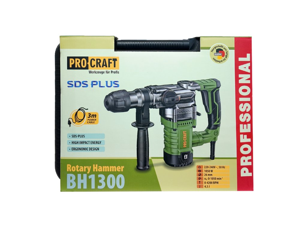 Kombinované kladivo Procraft BH1300 je určeno k práci se stavebními materiály jako jsou cihly, beton nebo kámen. Tři přepínatelné funkce zajišťují všestranné využití kladiva: vrtání, vrtání s příklepem, sekací funkce. Protože kladivo má rukojeť tvaru „D“,chrání vaši ruku před zraněním a zajišťuje pohodlné držení. Jako příslušenství lze použít SDS Plus příklepové vrtáky do betonu, ploché - špičaté nebo tvarované sekáče na stavební materiály, hadovité (spitálové) vrtáky a dláta do dřeva. Součástí dodávky je plochý a špičatý sekáč, tři vrtáky a přepravní kufr. Balení karton