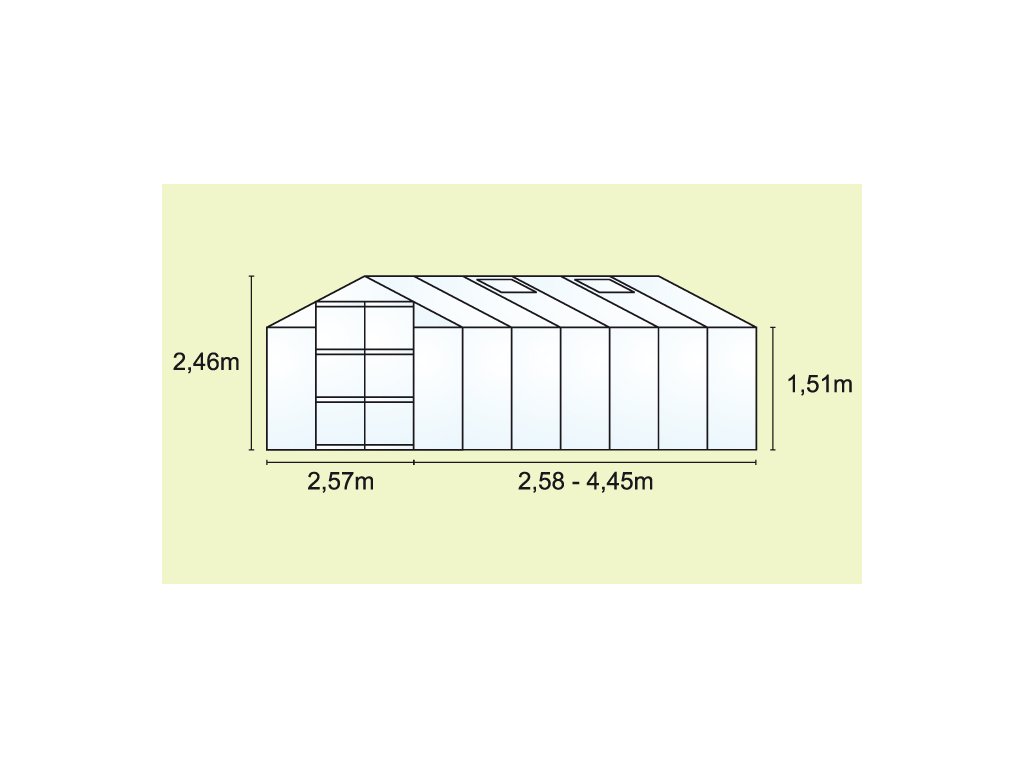 Obsahem balení jsou dvoukřídlé posuvné dveře (š x v otvoru = 1,22 x 1,91 m), AL profily, prosklení, 2x střešní ventilační okénko s manuálním otevíráním, veškerý spojovací materiál. Skleník lze postavit např. na zděnou podezdívku nebo na základnu z pozinkovaného plechu. Při stavbě bez podezdívky dokoupení základny doporučujeme. Ke skleníku je možné dokoupit řadu nadstandardního příslušenství - poličky, regály, další větrací střešní i boční okénka, automatické otvírače k těmto okénkům, okapové sady, teploměry, vlhkoměry, zavlažovací zařízení, elektrické odporové vytápění půdy.