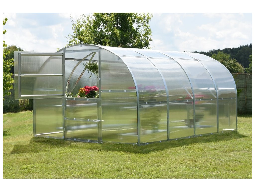 | obloukový skleník LANITPLAST TIBERUS | pozinkovaný ocelový profil 1mm, rozteč oblouků 100 cm, dvojité dveře vpředu, ventilační okno vzadu, prosklení nutno vyřezat z dodaných polykarbonátových desek, možnost montáže střešního okna - ano |