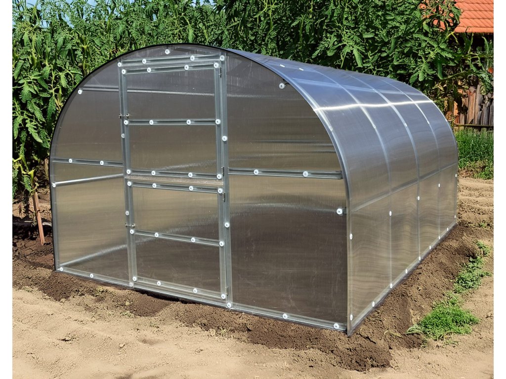 Konstrukce - konstrukce skleníku je sešroubovaná z pozinkovaných omega profilů síly 0,6 mm. Materiál profilů je galvanicky pozinkovaný. Jednotlivá žebra nosných oblouků jsou od sebe vzdálena 100 cm. Dvě podpěry na každém oblouku garantují vysokou únosnost celé konstrukce skleníku. Přední čelo skleníku má vestavěné jednokřídlé dělené dveře o světlosti 95 x 186 cm a na zadním čele je ventilační okno o rozměrech š 95 x v 90 cm. Pokud otevřete horní část dveří a zadní okno, zajistíte tím pohodlné větrání celého skleníku, aniž by do něj měly přístup děti nebo domácí zvířata. Obsahem dodávky každého skleníku je jedno střešní okno s manuálním ovládáním (otevřeno / zavřeno). K oknu doporučujeme dokoupit automatický otvírač, který otvírání a zavírání okna na základě teploty ve skleníku zařídí za Vás.