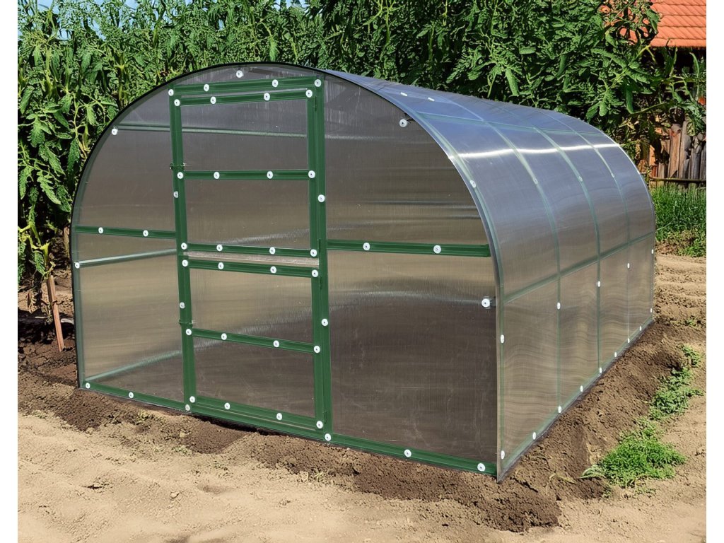 Konstrukce - konstrukce skleníku je sešroubovaná z pozinkovaných omega profilů síly 0,6 mm. Materiál profilů je galvanicky pozinkovaný. Jednotlivá žebra nosných oblouků jsou od sebe vzdálena 100 cm. Dvě podpěry na každém oblouku garantují vysokou únosnost celé konstrukce skleníku. Přední čelo skleníku má vestavěné jednokřídlé dělené dveře o světlosti 95 x 186 cm a na zadním čele je ventilační okno o rozměrech š 95 x v 90 cm. Pokud otevřete horní část dveří a zadní okno, zajistíte tím pohodlné větrání celého skleníku, aniž by do něj měly přístup děti nebo domácí zvířata. Obsahem dodávky každého skleníku je jedno střešní okno s manuálním ovládáním (otevřeno / zavřeno). K oknu doporučujeme dokoupit automatický otvírač, který otvírání a zavírání okna na základě teploty ve skleníku zařídí za Vás.