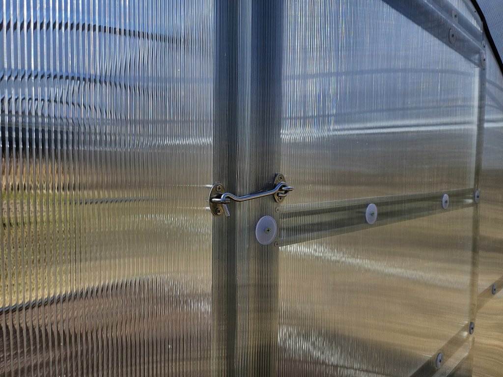 Konstrukce - konstrukce skleníku je sešroubovaná z pozinkovaných omega profilů síly 0,6 mm. Materiál profilů je galvanicky pozinkovaný. Jednotlivá žebra nosných oblouků jsou od sebe vzdálena 100 cm. Dvě podpěry na každém oblouku garantují vysokou únosnost celé konstrukce skleníku. Přední čelo skleníku má vestavěné jednokřídlé dělené dveře o světlosti 95 x 186 cm a na zadním čele je ventilační okno o rozměrech š 95 x v 90 cm. Pokud otevřete horní část dveří a zadní okno, zajistíte tím pohodlné větrání celého skleníku, aniž by do něj měly přístup děti nebo domácí zvířata. Obsahem dodávky každého skleníku je jedno střešní okno s manuálním ovládáním (otevřeno / zavřeno). K oknu doporučujeme dokoupit automatický otvírač, který otvírání a zavírání okna na základě teploty ve skleníku zařídí za Vás. Polykarbonát - dvoustěnný polykarbonát 4 mm se silným UV filtrem vyrobený v EU (proto na slunci nežloutne a nekřehne). Smluvní prodloužená záruka 5 let na nerozbitnost polykarbonátu krupobitím.
