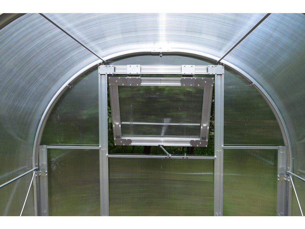 šířka 2,9 m, cca délky 4 / 6 / 8 m, masivní 1 mm silný a 65 mm široký eloxovaný hliníkový profil, rozteč oblouků 100 cm, vnitřní podpěry obloukové konstrukce, dvojité dveře vpředu, ventilační okno vzadu, prosklení nutno vyřezat z dodaných polykarbonátových desek |