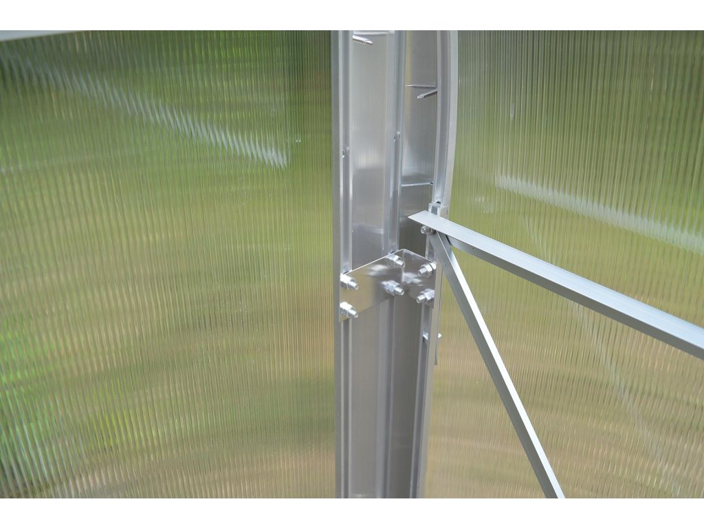 Konstrukce skleníku je sešroubovaná z masivních 1 mm silných a 65 mm širokých eloxovaných hliníkových profilů. Všechny šroubované spoje jsou z hliníkových šroubů a matek, panty a petlice jsou vyrobené z nerezové oceli, takže se jedná o korozi absolutně odolný skleník. Jednotlivá žebra nosných oblouků jsou od sebe vzdálena osově 100 cm. Přední čelo má dvoudílné dveře na pantech, zadní čelo obsahuje větrací okénko. Skleník není průchozí. Jako příplatkové příslušenství lze dokoupit různé druhy regálů, teploměry, vlhkoměry apod.
