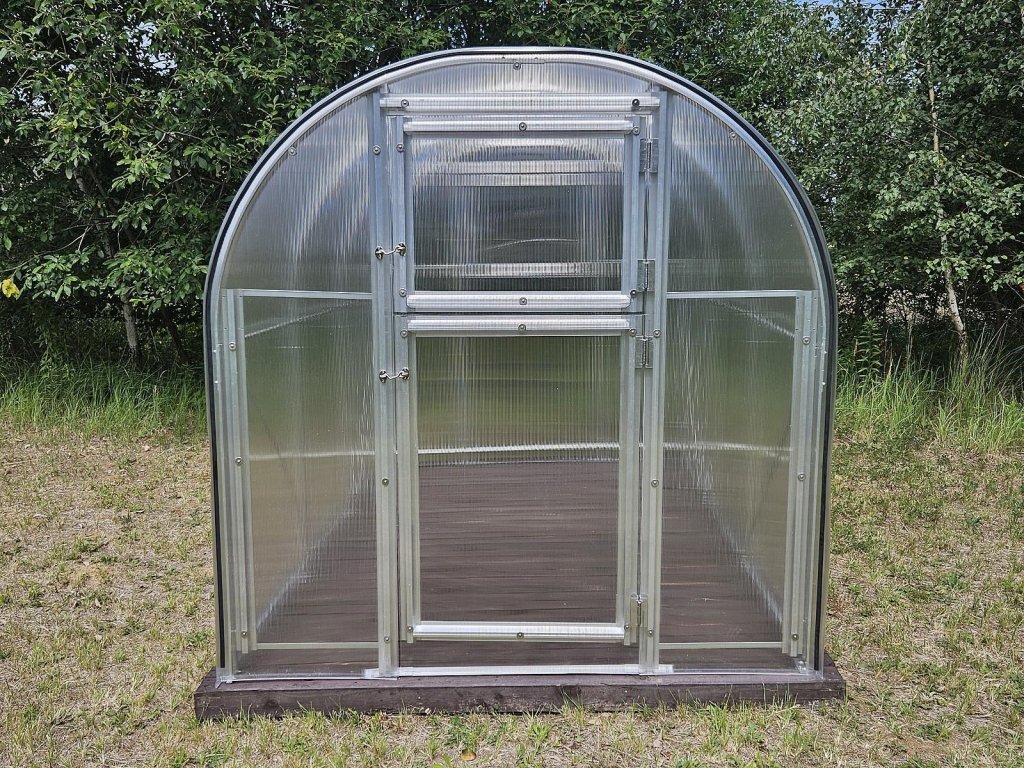 šířka 2,0 m, cca délky 3 / 4 / 5 m, masivní 1 mm silný a 65 mm široký eloxovaný hliníkový profil, rozteč oblouků 100 cm, dvojité dveře vpředu, ventilační okno vzadu, prosklení nutno vyřezat z dodaných polykarbonátových desek |