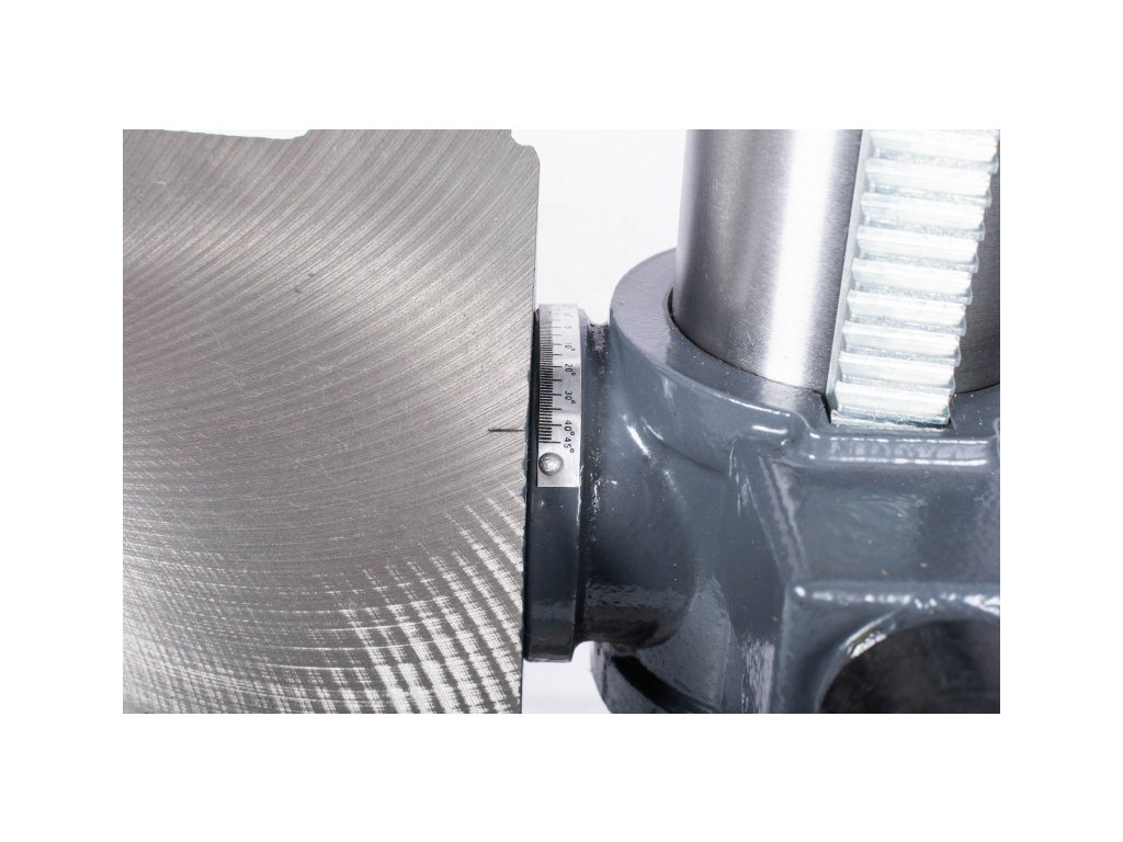 - Rozměrný stůl s výškovým nastavením pomocí ozubeného hřebene a naklápěním +/- 45°