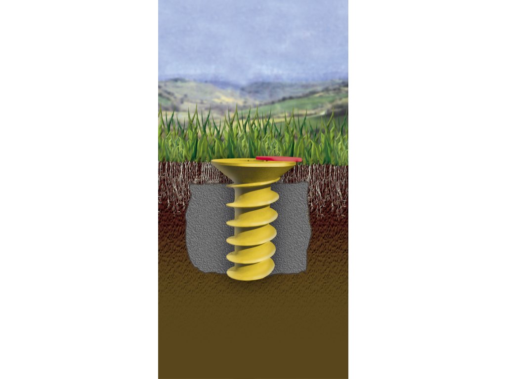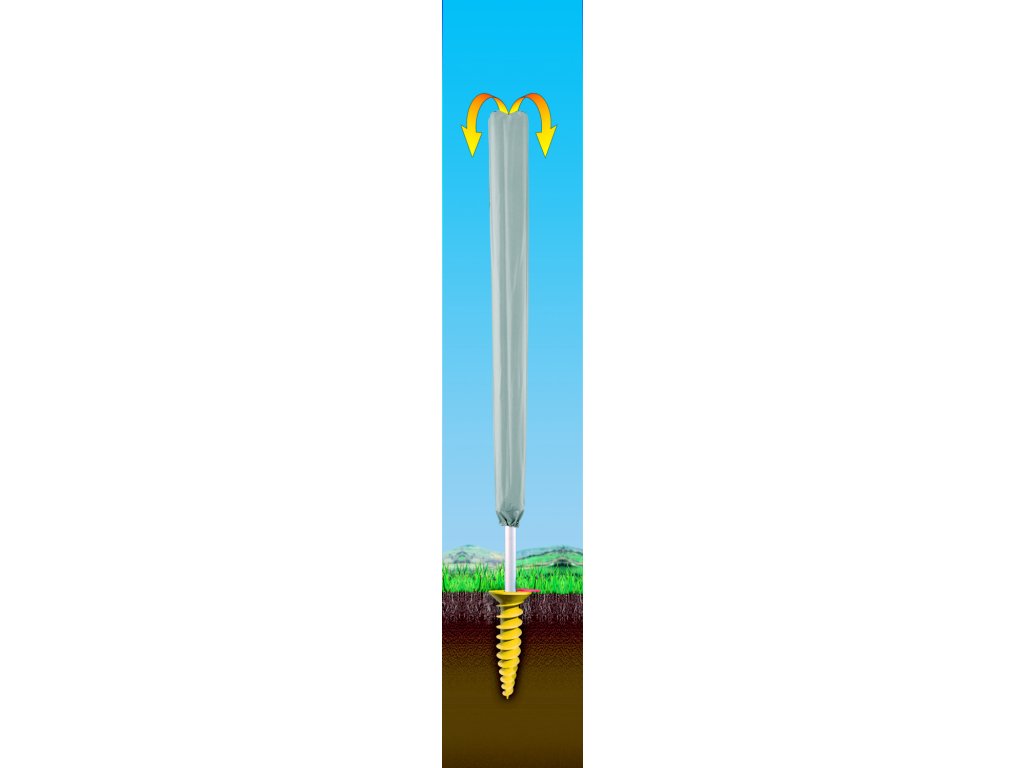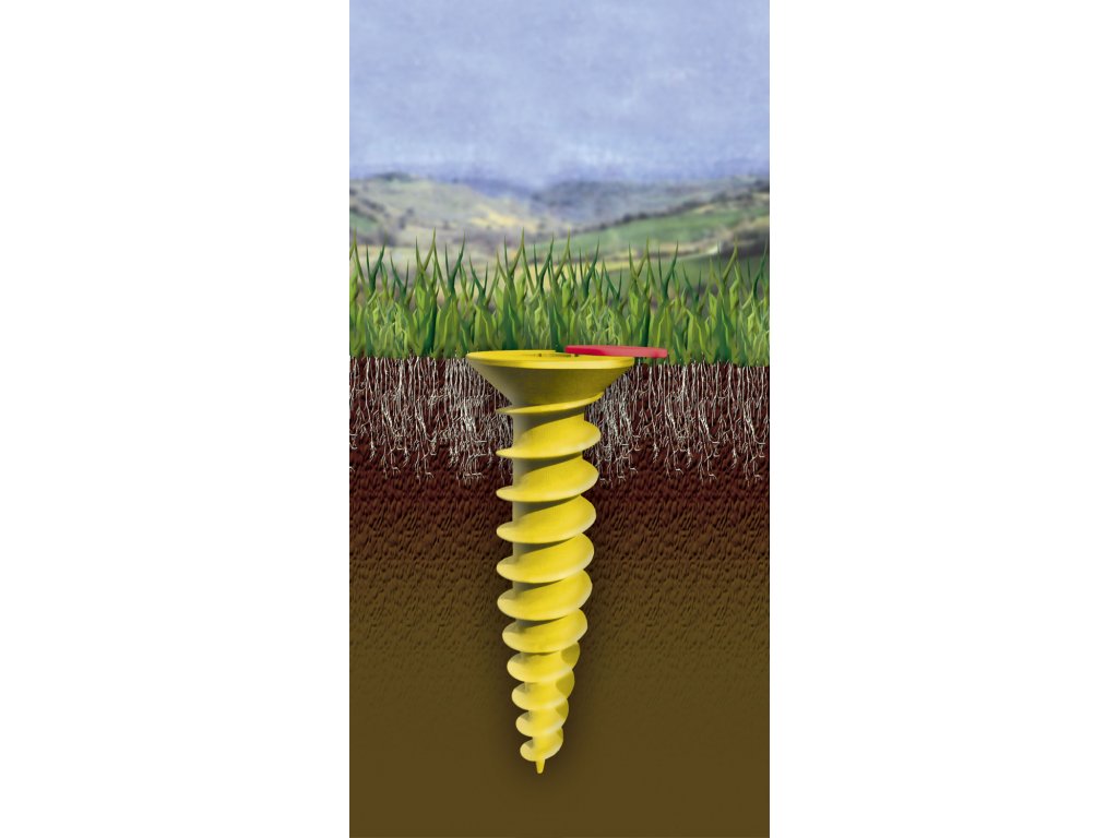 Dvojitý zemní šroub = ukotvení do země je vyřešeno pomocí delšího dvojitého plastového zemního šroubu. Ten se zašroubuje (zavrtá) do země a do něj se zasune nosná tyč sušáku. Není nutné nic betonovat. Výhodou zemního šroubu je možnost postavit sušák na zahradě kdekoliv, kde je možné zemní šroub zavrtat do země. Šroub je opatřen plastovým víčkem. Šroub se musí zavrtat do roviny s povrchem, pak je bezpečný i pro travní sekačku. K dokoupení jako doplňková výbava.