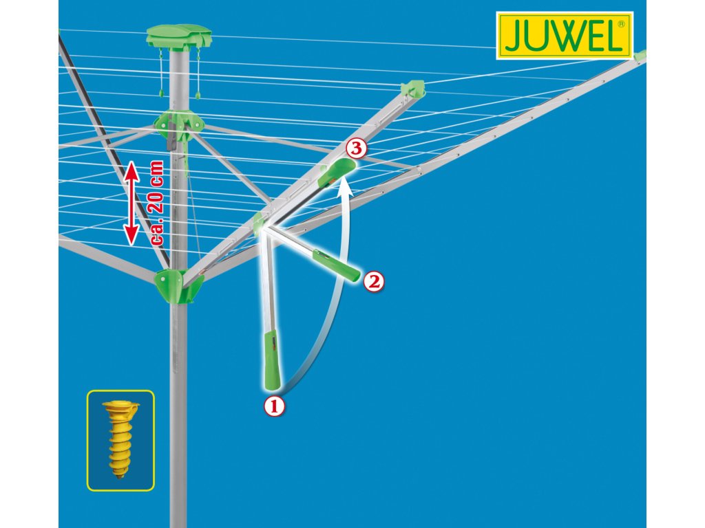 Jednoduchý zemní šroub = ukotvení do země je vyřešeno pomocí plastového zemního šroubu. Ten se zašroubuje (zavrtá) do země a do něj se zasune nosná tyč sušáku. Není nutné nic betonovat. Výhodou zemního šroubu je možnost postavit sušák na zahradě kdekoliv, kde je možné zemní šroub pevně zavrtat do země. Šroub je opatřen plastovým víčkem. Šroub se musí zavrtat do roviny s povrchem, pak je bezpečný i pro travní sekačku.