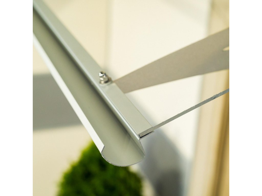 Stříška nad dveře vyrobená z eloxovaného hliníku. Na rozdíl od stříšek s plastovou konstrukcí hliníková konstrukce perfektně odolává vlivům počasí, i po letech je pevná a stabilní. V zimě mrazem nekřehne a ani na silném letním slunci nedochází ke změnám barvy. Stříška je zasklená úplně průhledným čirým plexisklem 4 mm.