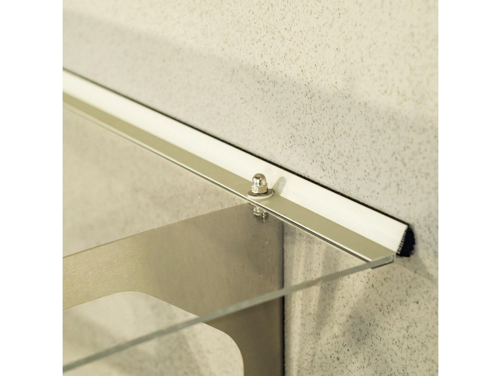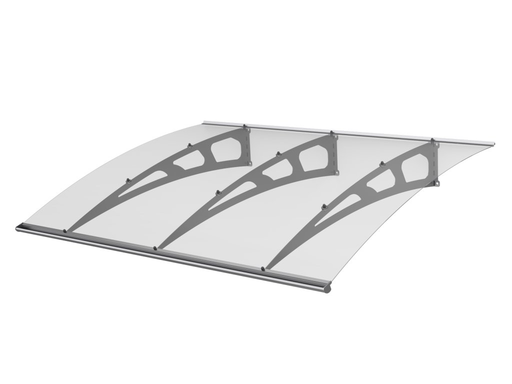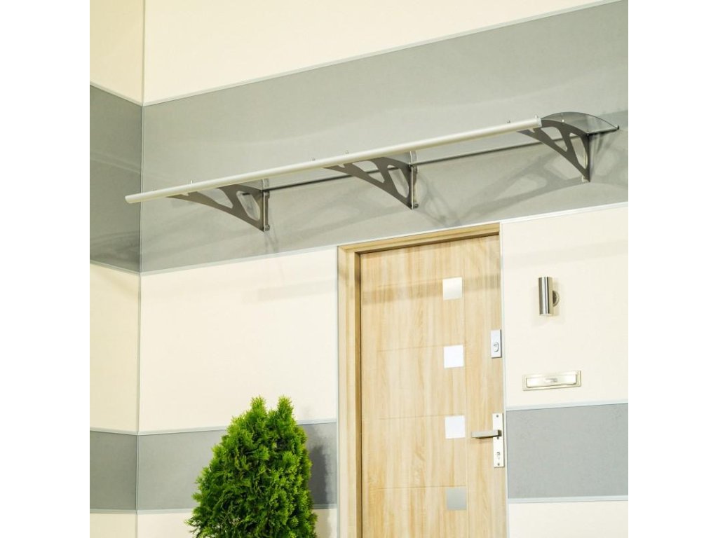 Obrovská stříška nad dveře vyrobená z eloxovaného hliníku. Na rozdíl od stříšek s plastovou konstrukcí hliníková konstrukce perfektně odolává vlivům počasí, i po letech je pevná a stabilní. V zimě mrazem nekřehne a ani na silném letním slunci nedochází ke změnám barvy. Stříška je zasklená úplně průhledným čirým plexisklem 4 mm.