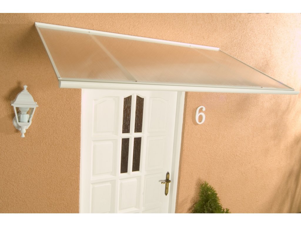 Stříška nad dveře vyrobená z práškově lakovaného hliníku. Na rozdíl od stříšek s plastovou konstrukcí hliníková konstrukce perfektně odolává vlivům počasí, i po letech je pevná a stabilní. V zimě mrazem nekřehne a ani na silném letním slunci nedochází ke změnám barvy. Stříška je zasklená komůrkovým polykarbonátem síly 4,5 mm s oboustranným UV filtrem (značka LEXAN® - vyrobeno v Rakousku). Jde o velmi kvalitní značkový polykarbonát od jednoho z nejlepších světových výrobců.