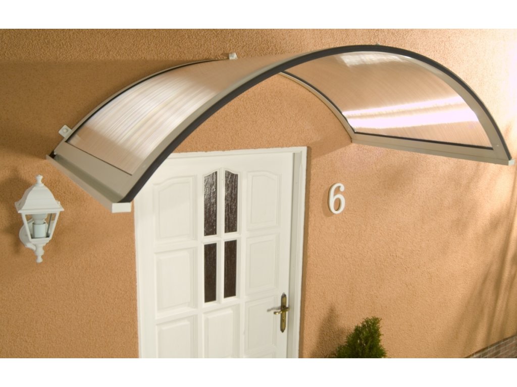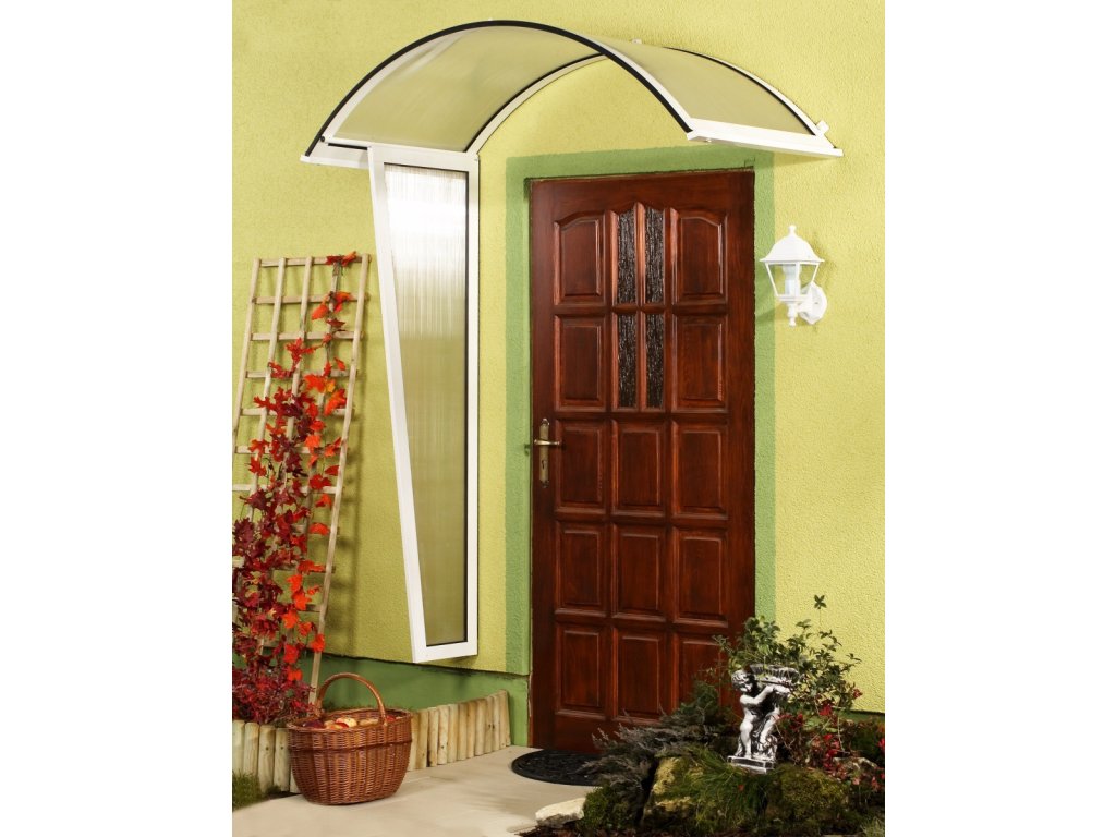 Stříška nad dveře vyrobená z práškově lakovaného hliníku. Na rozdíl od stříšek s plastovou konstrukcí hliníková konstrukce perfektně odolává vlivům počasí, i po letech je pevná a stabilní. V zimě mrazem nekřehne a ani na silném letním slunci nedochází ke změnám barvy. Stříška je zasklená komůrkovým polykarbonátem síly 4,5 mm s oboustranným UV filtrem (značka LEXAN® - vyrobeno v Rakousku). Jde o velmi kvalitní značkový polykarbonát od jednoho z nejlepších světových výrobců.