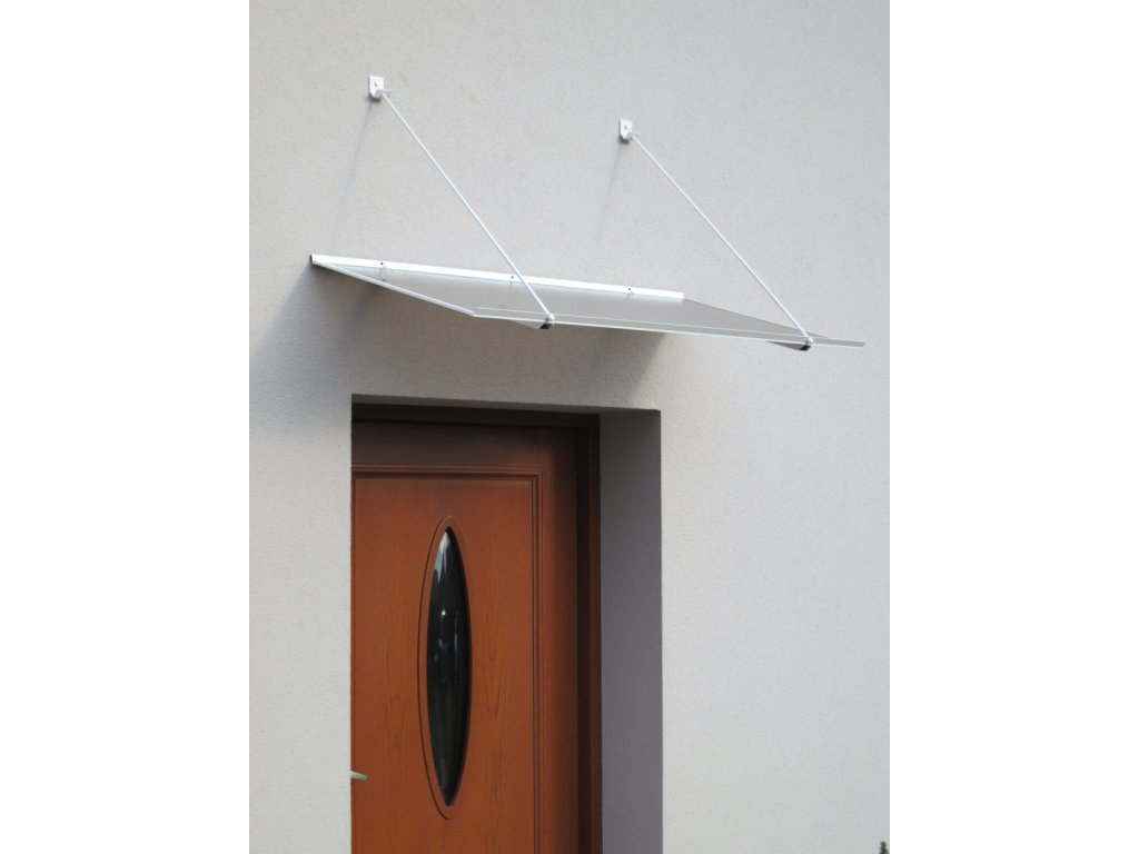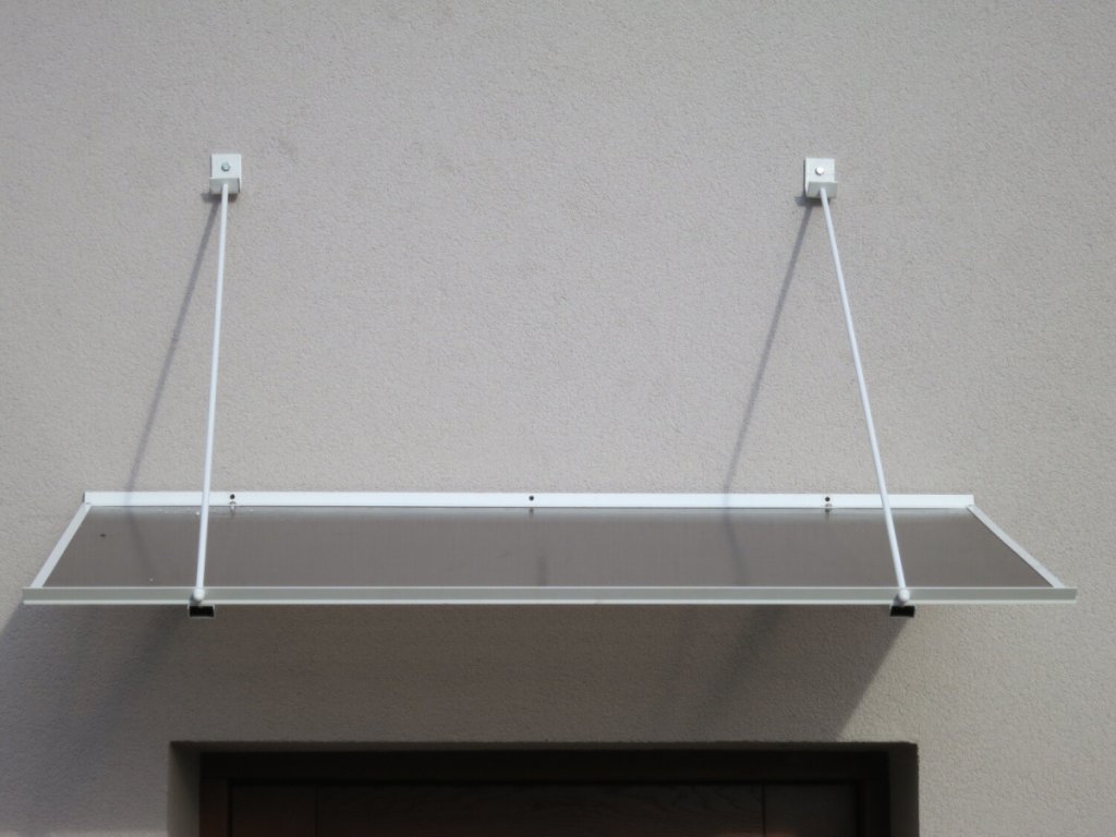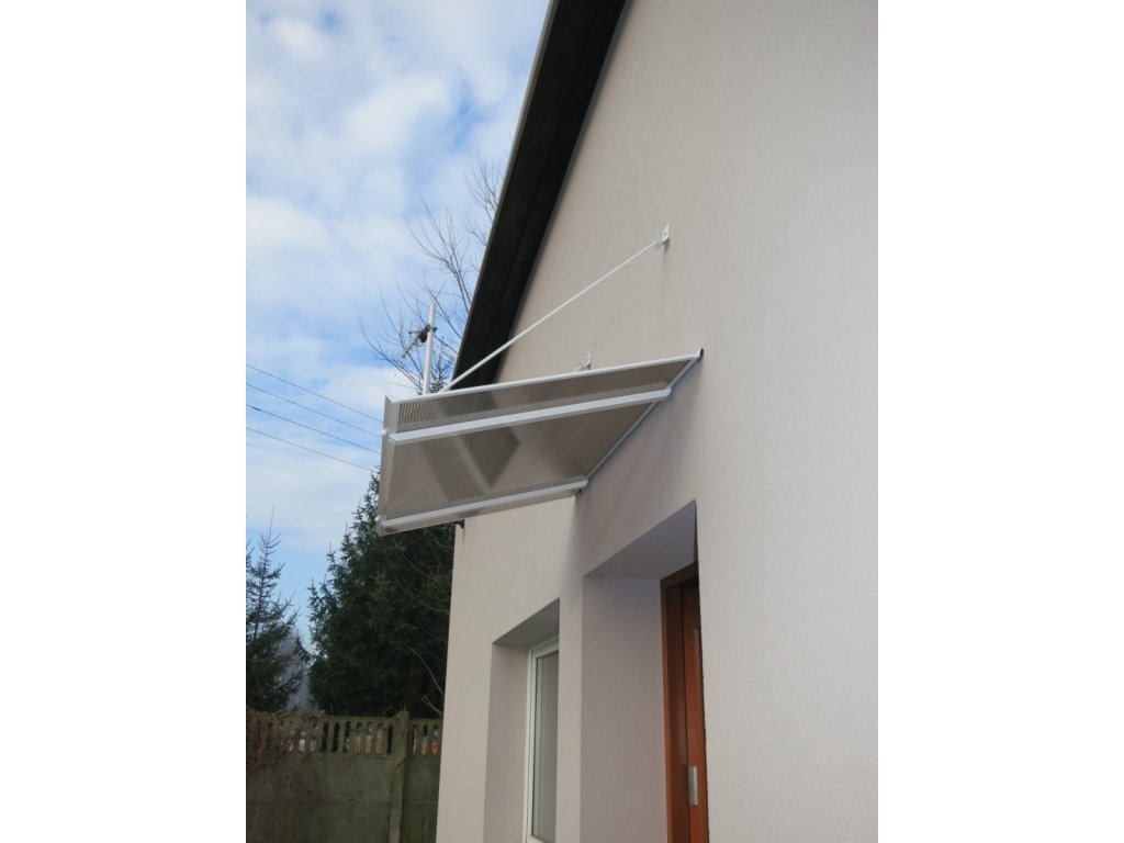 Plochá stříška nad dveře vyrobená z práškově lakovaného hliníku. Na rozdíl od stříšek s plastovou konstrukcí hliníková konstrukce perfektně odolává vlivům počasí, je i po letech pevná a stabilní. V zimě mrazem nekřehne a ani na silném letním slunci nedochází ke změnám barvy. Stříška je zasklená průsvitným kouřově hnědým (bronz) komůrkovým polykarbonátem síly 4,5 mm s oboustranným UV filtrem (značka LEXAN® - vyrobeno v Rakousku). Jde o velmi kvalitní značkový polykarbonát od jednoho z nejlepších světových výrobců.