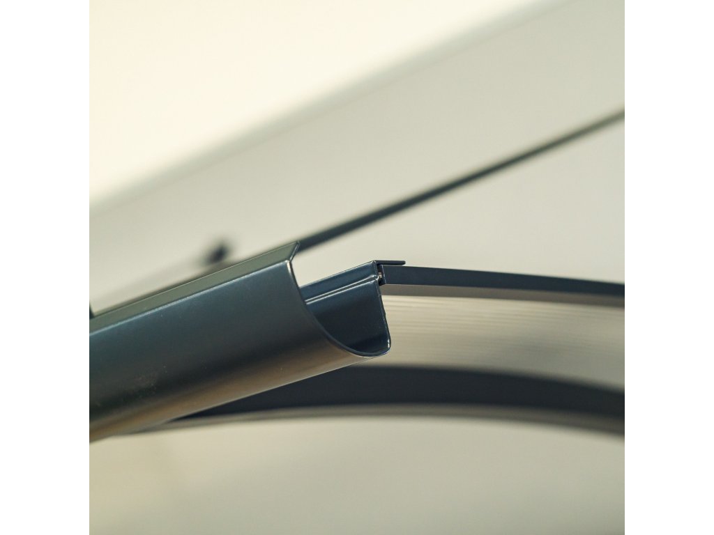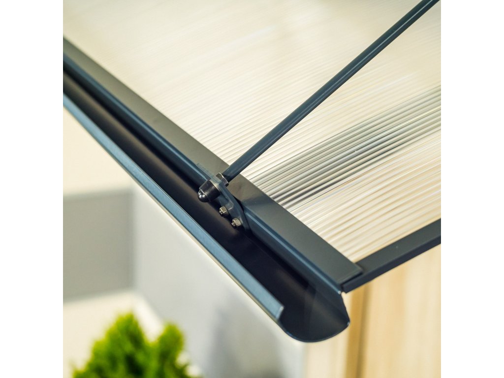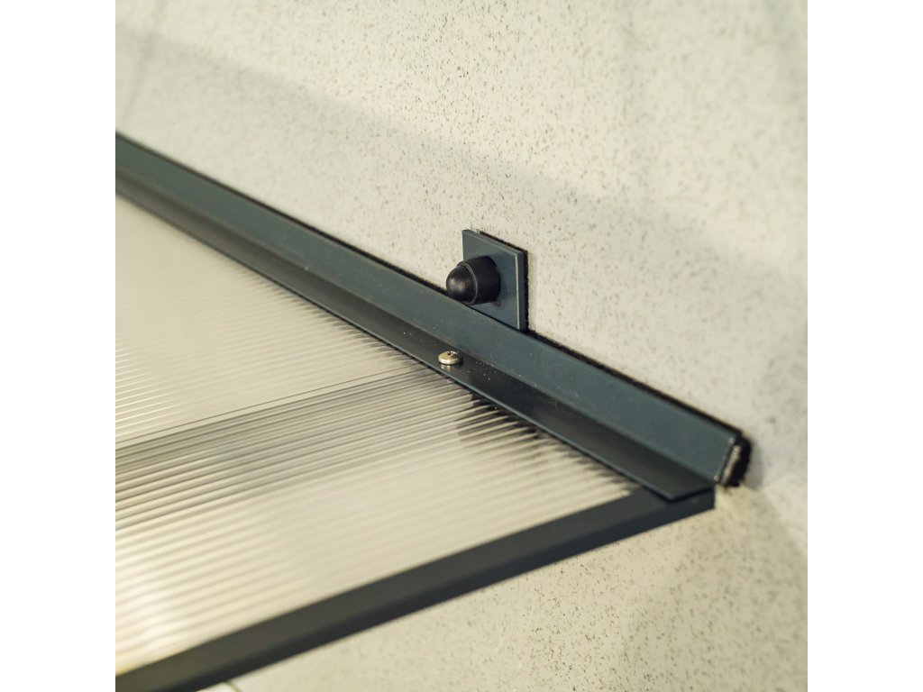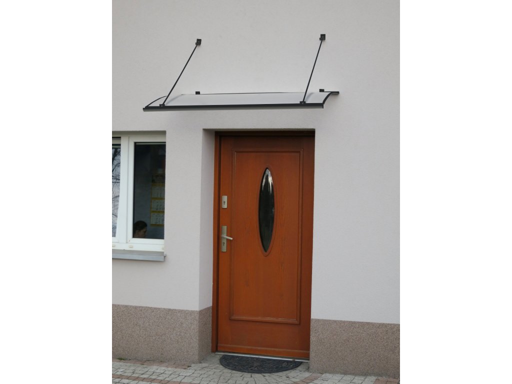 Stříška nad dveře vyrobená z práškově lakovaného hliníku. Na rozdíl od stříšek s plastovou konstrukcí hliníková konstrukce perfektně odolává vlivům počasí, i po letech je pevná a stabilní. V zimě mrazem nekřehne a ani na silném letním slunci nedochází ke změnám barvy. Stříška je zasklená komůrkovým polykarbonátem síly 4,5 mm s oboustranným UV filtrem (značka LEXAN® - vyrobeno v Rakousku). Jde o velmi kvalitní značkový polykarbonát od jednoho z nejlepších světových výrobců.