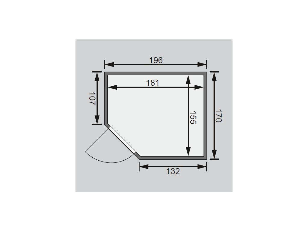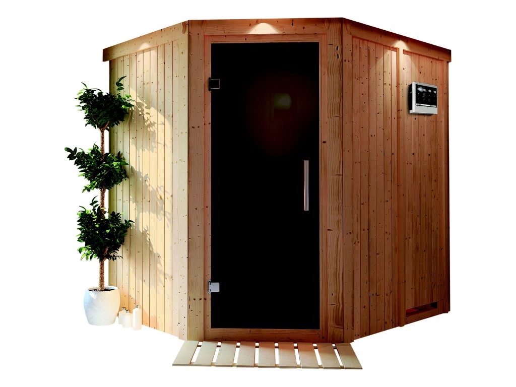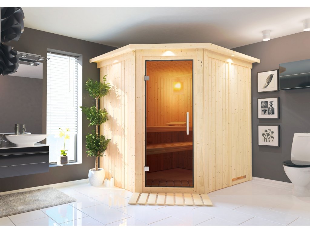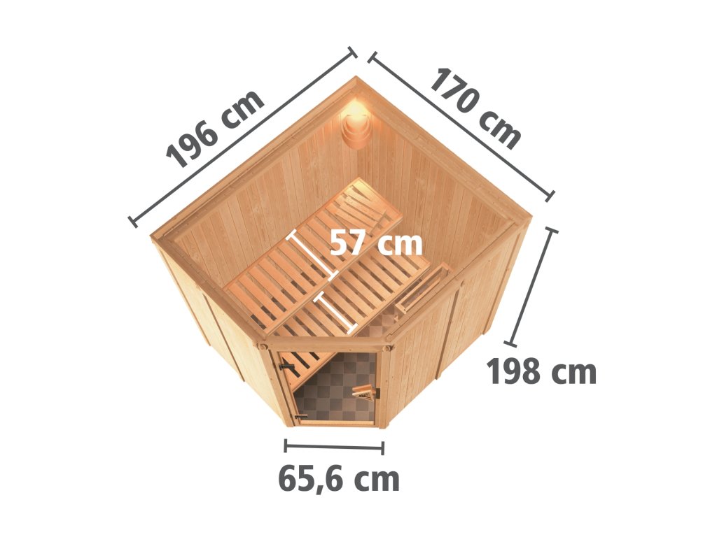 Finská sauna je určená pro dvě ležící osoby. Má rozměr š 196 x h 170 x v 198 cm s rohovými dveřmi. Tento model finské sauny je určený do temperovaných interiérů domu nebo bytu. Její výrobce, firma KARIBU HOLZTECHNIK z německých Brém, dokázala svými výrobky úspěšně navázat na staletou tradici skandinávského saunování a současně do ní zapracovat dnešní moderní technologie. Sauna je celá vyrobena ze dřeva severského smrku v přírodním provedení. Dřevo pochází ze vzdáleného severu Evropy a je chemicky naprosto neošetřené (není ani namořeno ani nalakováno). V důsledku toho je prosté všech známých problematických látek, které by se v průběhu saunování mohly ze dřeva uvolňovat. Tato interiérová sauna vykazuje mimořádné tepelně-izolační vlastnosti. Stěny sauny jsou složeny z vnitřní a vnější vrstvy speciálně hlazených prken s perem a drážkou, mezi kterými je 42 mm silná tepelná izolace v podobě minerální vlny. Celková síla stěny je tak 68 mm. Zadní nebo boční nepohledové strany orientované ke stěně místnosti mají vnější stranu ze sololitu. Proto jsou při stejné tepelné izolaci o cca 10 mm tenčí než pohledové strany pokryté palubkami.