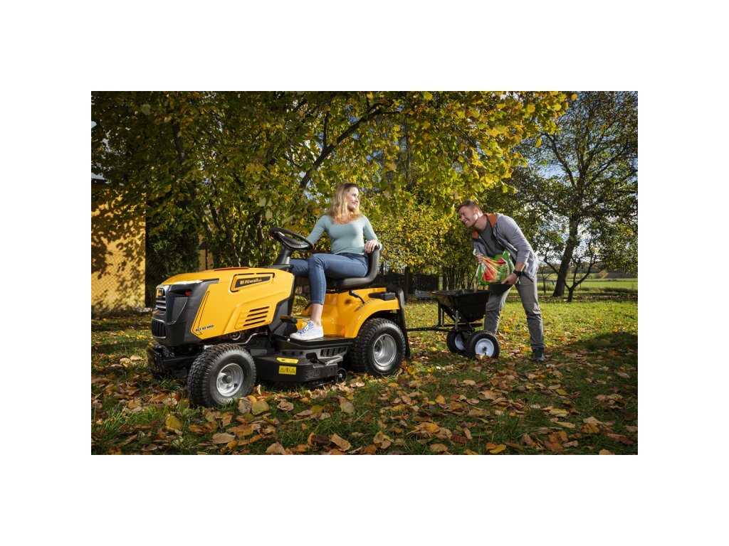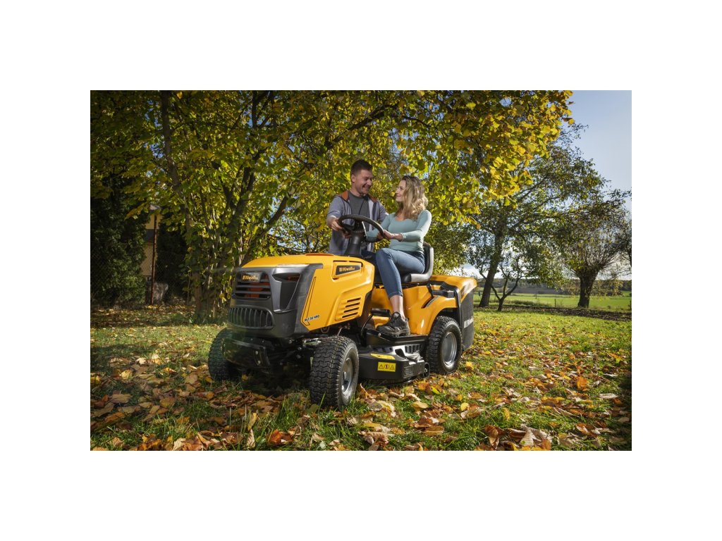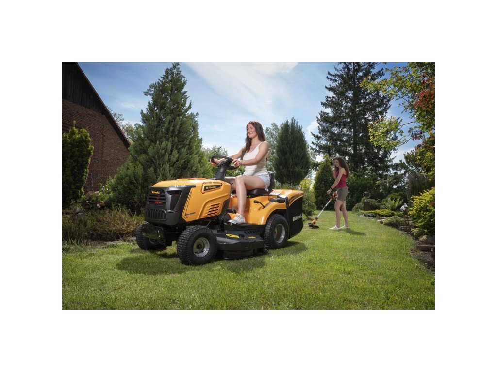 Riwall RLT 92 HRD je moderní travní traktor určený pro údržbu pozemků o rozloze do 5 000 m2. Díky výkonnému motoru Loncin, širokému žacímu ústrojí a komfortní hydrostatické převodovce nabízí spojení síly, spolehlivosti a pohodlí. Tento traktor se stane ideálním pomocníkem na zahradě i v okolí domu, a to nejen pro sečení, ale i pro celoroční práce s taženým příslušenstvím. Hydrostatická převodovka Traktor je osazen moderní hydrostatickou převodovkou TUFF TORQ od prestižního amerického výrobce. Díky ní je ovládání stroje mimořádně jednoduché – rychlost a směr jízdy určujete pouze kolébkovým pedálem, bez nutnosti řazení převodových stupňů. Tento systém přináší komfortní a plynulou jízdu i při práci na členitých pozemcích. Traktor je posazen na velkých kolech (vpředu 15" a vzadu 18") pro lepší ochranu trávníku a větší komfort jízdy při překonávání teréních nerovností. Přední náprava je osazena systémem naklápění kol do strany při změně směru, který se stará o perfektní kopírování poloměru zatáčky bez zbytečného poškození trávníku způsobeného "hrnutím" kol dopředu. Výkonný motor Srdcem celého stroje je jednoválcový motor Loncin o maximálním výkonu 12,5 HP a objemu 452 cm3. Motor je vybaven litinovou vložkou válce, tlakovým mazáním a robustním palivovým čerpadlem, což zaručuje dlouhou životnost a spolehlivý chod i v náročných podmínkách. Účinný vyvažovací systém snižuje vibrace a zaručuje stabilnější provoz. Díky optimalizovanému chlazení, dvojitému vzduchovému filtru a ventilům potažených slitinou kobaltu motor pracuje tiše, úsporně a s nízkými emisemi. Žací a sběrné ústrojí Žací ústrojí o šířce 92 cm zajišťuje rychlé posečení velkých ploch a zároveň dovoluje sekat těsně u zídek nebo chodníků. Plovoucí konstrukce s antiskalpovacími kolečky chrání trávník na nerovném terénu. Díky hladkým řemenům žací nože při nárazu na překážku lehce proklouznou, čímž minimalizují riziko poškození uložení hřídele. Posekaná tráva je odváděna do velkého sběrného koše o objemu 245 l, který lze snadno vysypat přímo z místa řidiče. Praktická je i akustická signalizace plného koše. Traktor nabízí funkci 3v1, to znamená, že kromě sběru do koše lze s vhodným dopňkovým příslušenstvím (RACC00129, RACC00088) využít i funki mulčování nebo zadního výhozu. Komfort a ergonomie Obsluha traktoru je maximálně jednoduchá. Ergonomicky rozmístěné ovládací prvky, elektrické startování a elektromagnetická spojka nožů umožňují rychlé a pohodlné spuštění sečení. Rozhodně oceníte i možnost sečení při couvání, kdy nemusíte neustále vypínat a zapínat žací ústrojí. Pohodlí při jízdě zajišťuje odpružené, podélně nastavitelné sedadlo, vyvýšený ergonomický volant a lehce zpřevodované řízení s malým poloměrem otáčení. Přehledná kontrola paliva je umožněna díky nádrži z průsvitného plastu o objemu 7,5 l. Díky nízkému středovému tunelu a protiskluzovým opěrkám je nástup i výstup z traktoru velmi pohodlný. Odolnost a výbava Rám i žací ústrojí jsou z odolné oceli svařované roboticky s vysokou přesností. Povrchová úprava pomocí moderního práškového lakování chrání kovové prvky proti korozi. Kapota s velkým úhlem otevření poskytuje snadný přístup k motoru, zatímco speciální průduchy zajišťují jeho optimální chlazení. Traktor je vybaven moderními LED světlomety, širokým předním nárazníkem a integrovanou tryskou pro připojení hadice, která umožňuje snadné čištění žacího prostoru. Praktickým detailem je držák na nápoje a sada základního nářadí dodávaná spolu se strojem. Díky tažnému zařízení lze připojit širokou škálu příslušenství – od vozíků a rozmetadel až po válce, provzdušňovače nebo odmechovače. Veškeré příslušentství je k vidění v sekci "Příslušenství" nacházející se pod popisem. Využijte prodloužené záruky Bližší informace o záručních podmínkách naleznete zde. Případné bezpečnostní pokyny, výstrahy a upozornění jsou součástí návodu k obsluze, který je k dispozici v sekci KE STAŽENÍ. Kontaktní údaje výrobce / dovozce / zplnomocněného zástupce výrobce v EU: GARLAND distributor, s.r.o. Šturmova 1307, 50601 Jičín, Czech Republic email: garland@garland.czDoplňkové parametry