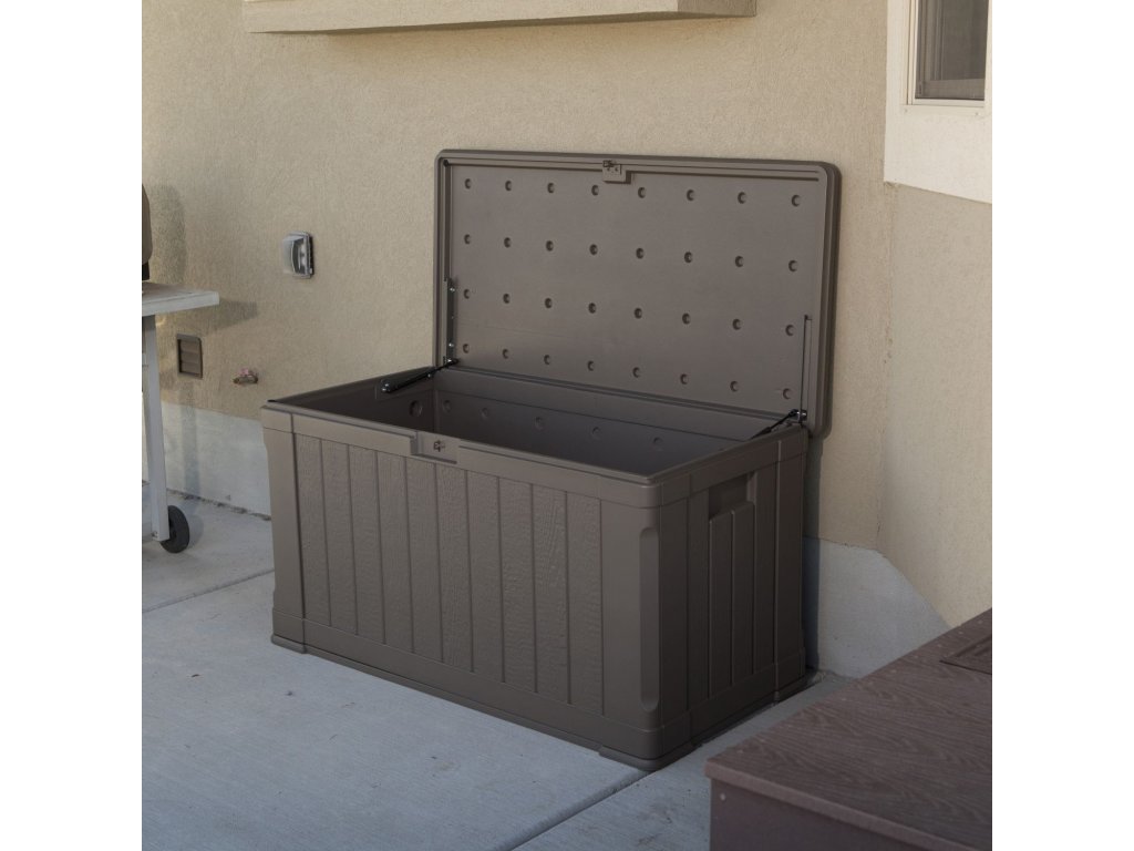 Velký plastový box o objemu 440 litrů pro uskladnění vašich drobných zahradních potřeb. Je vyroben z masivního polyethylenu v moderním designu. S pomocí této bedny vyřešíte problém, kam uložit venkovní hračky vašich dětí, bazénové příslušenství nebo nejčastěji látkové nebo molitanové povlaky venkovních židlí. Své využití nalezne i jako stůl pro zahradní párty. Box je možné proti nenechavcům uzamknout visacím zámkem (není obsahem dodávky).