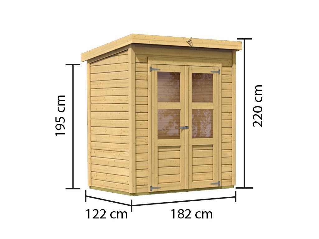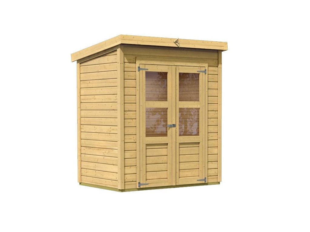 Základní model dřevěného domku pro vaši zahradu. Tento model má pultovou střechu a dvoukřídlé dveře na pantech s oknem v každém křídle. Stavebním materiálem domku jsou dřevěné profily síly 14 mm perfektně vyfrézované ze severského smrku. Dodáváme jako stavebnici v rozloženém stavu, kde stěny tvoří jednotlivé dřevěné profily, které pouze sesadíte k sobě a sešroubujete, střechu tvoří celistvá deska. To garantuje extrémně jednoduchou montáž, kterou zvládne každý český kutil.
